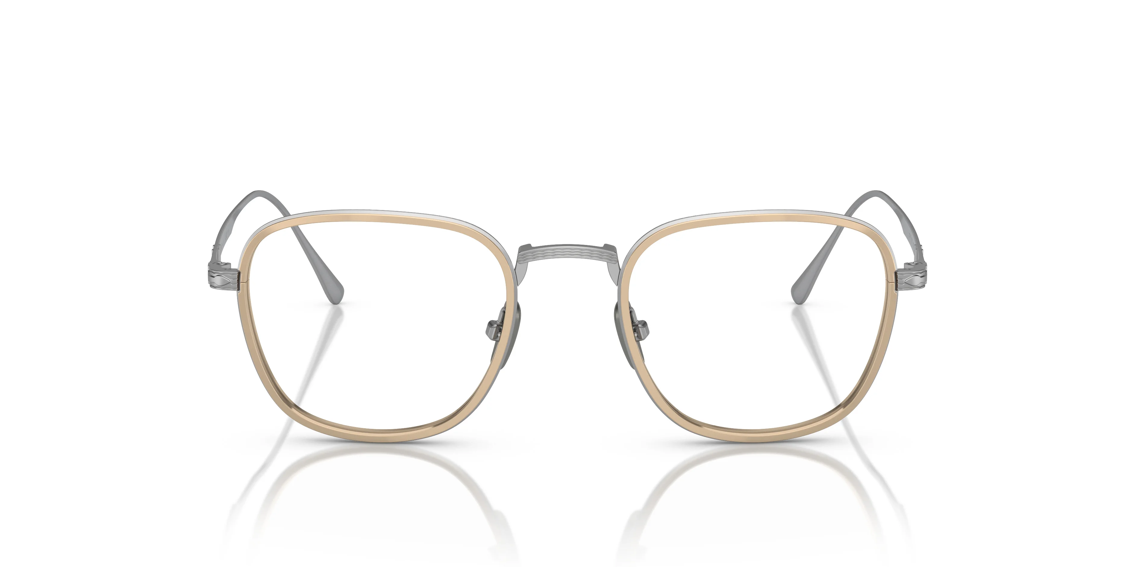 With its new squared shape, this titanium model perfectly combines the skill, refinement and modernity of Japanese style with the distinctly Italian artisanal quality that has always defined Persol MODEL CODE: PO5007VT 8010 45-21 FRONT COLOR: Silver/Gold LENS COLOR: Clear LENS MATERIAL: Plastic FRAME MATERIAL: Titanium FIT: Narrow Fitting BRIDGE CHOICE & NOSEPAD: Adjustable Nosepads MADE IN: Japan