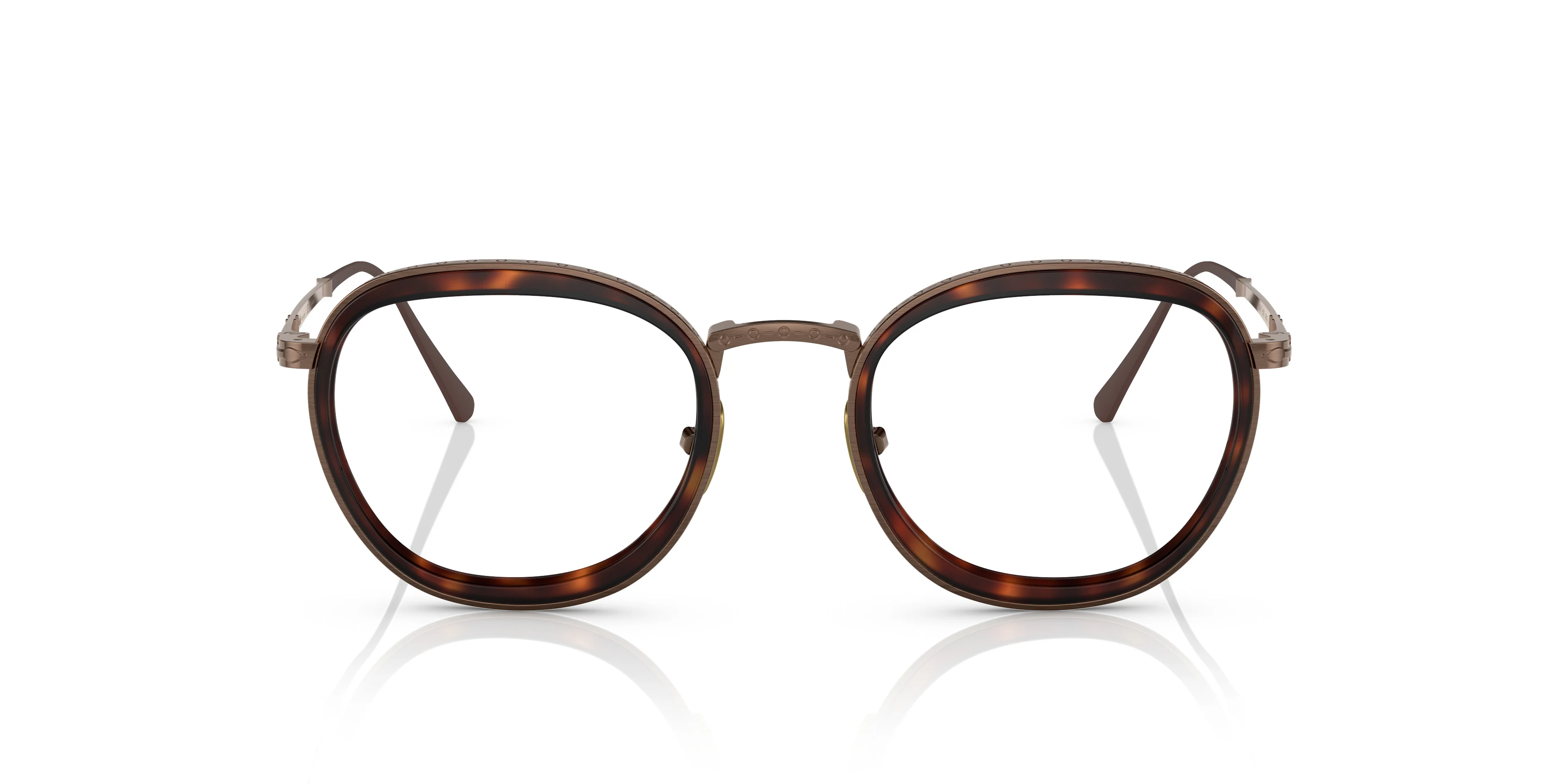 Persol once again sets new impeccable standards of quality with this phantos shape with both titanium and acetate detailing. This optical style boasts unique engraving on 4 contemporary and classic titanium colorways. MODEL CODE: PO5009VT 8016 49-20 FRONT COLOR: Brown LENS COLOR: Clear LENS MATERIAL: Plastic FRAME MATERIAL: Titanium FIT: Narrow Fitting BRIDGE CHOICE & NOSEPAD: Adjustable Nosepads MADE IN: Japan