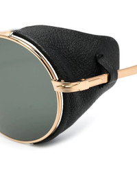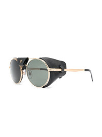 tinted leather-side rounded sunglasses gold-tone round frame green tinted lenses leather sides curved tips These glasses come with a protective case. Made in Italy Composition Metal (Other) 100% SIZE & FIT Measurement Arm Length 5.51 in(14 cm) Bridge Width 0.7 in(1.8 cm) Lens Diameter 2.04 in(5.2 cm) Total Width 5.51 in(14 cm)