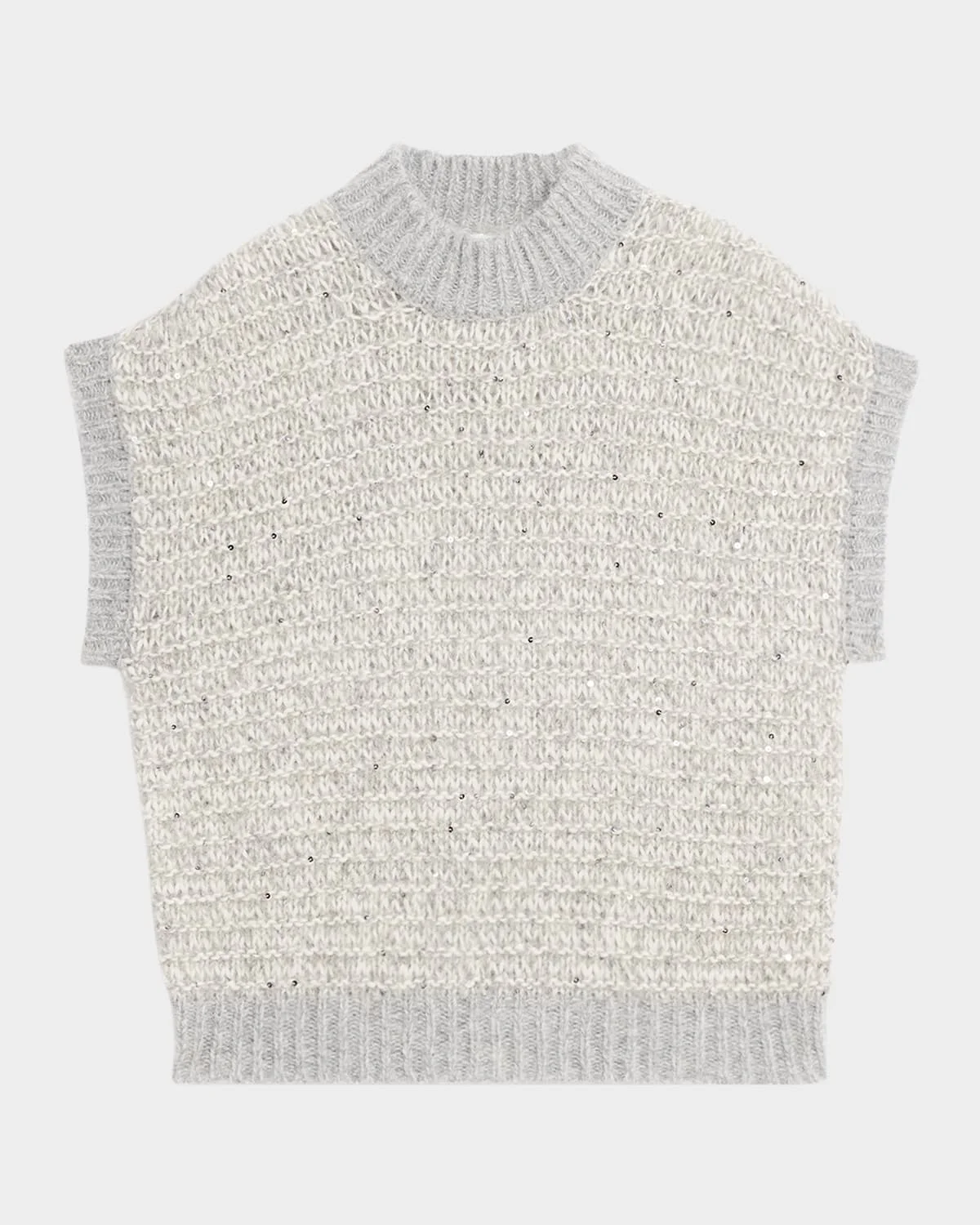 Peserico shaker rib stitch sweater vest embellished with microsequin accents Contrast ribbed finishes on the collar, cuffs, and hem Mock neckline Short kimono sleeves Relaxed fit Pullover style Virgin wool/polyester/virgin wool Dry clean Made in Italy