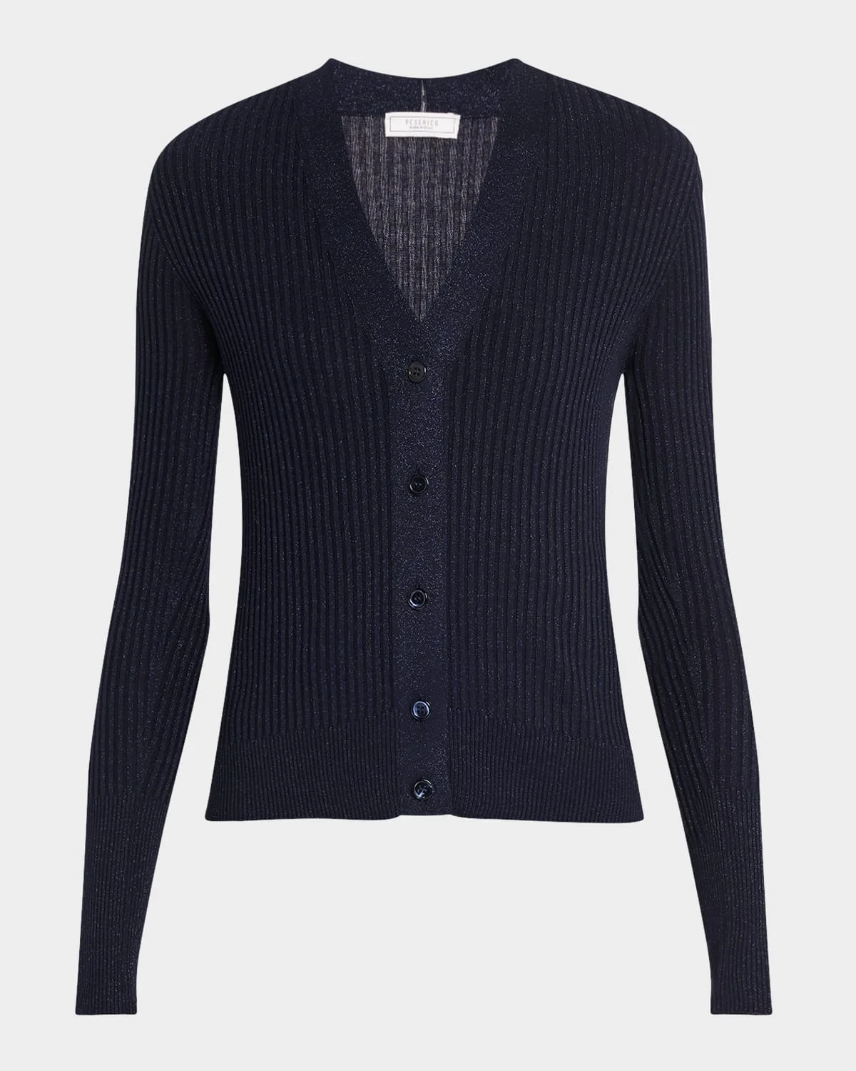 Peserico cardigan in a rib knit Approx. 23"L from shoulders to hem V neckline; button front Long sleeves; approx. 23.5"L Slim fit Viscose/nylon/polyamide/metallic fibers Unlined Dry clean, hand wash Made in Italy