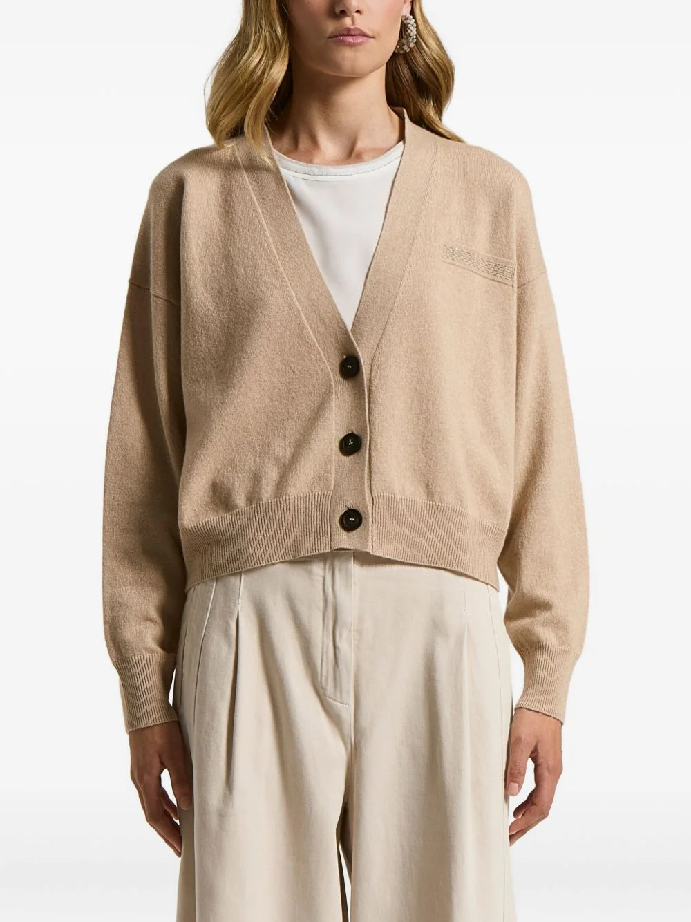 button embellished cardigan Highlights - Beige - V-neck - Front button fastening - Long sleeves - Chest embellishment - Ribbed hem Made in Italy Composition Virgin Wool 55%, Silk 30%, Cashmere 15% Washing instructions Read Manufacturer Guidelines
