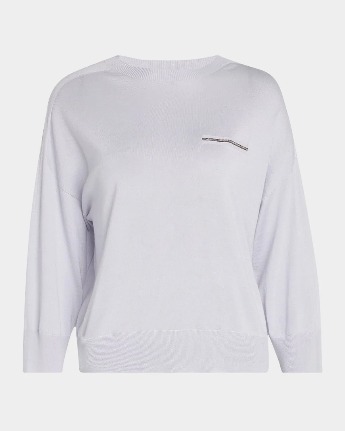 Peserico knit sweater in an ultrasoft and sumptuous blend of cashmere and silk Approx. 22.04"L from shoulders to hem Signature chain trim on the left chest Ribbed crew neckline Drop shoulders 3/4 sleeve; approx. 13.0"L Ribbed cuffs and hem Classic fit Pullover style Cashmere/silk Unlined Dry clean, hand wash Made in Italy