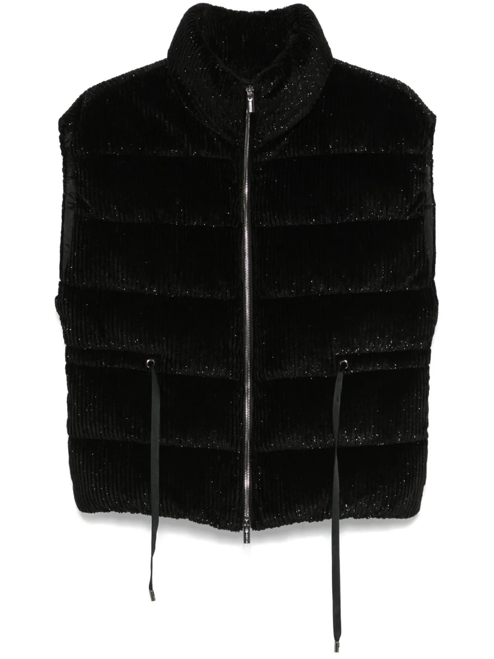 corduroy gilet Highlights - Black - Corduroy - Metallic threading - Quilted - Front zip fastening - Padded design - Goose down blend filling - Stand-up collar - Sleeveless - Drawstring waist - Two side zip-fastening pockets - Full lining - Straight hem Made in Italy Composition Outer: Polyester 34%, Nylon 32%, Viscose 27%, Acetate 6%, Polyamide 1% Lining: Goose Down 90%, Goose Feather 10% SIZE & FIT Model measurements Height 5 ft 9 in(1.75 m) Bust/Chest 30.7 in(78 cm) Hips 35.03 in(89 cm) Waist 23.62 in(60 cm) FittingInformation Designed for a relaxed fit, this piece allows for comfort and movement when worn The adjustable drawstring means that you can adjust this piece’s fit to suit your comfort and preference Made from a padded non-stretch fabric, giving it no natural elasticity Washing instructions Dry Clean Only
