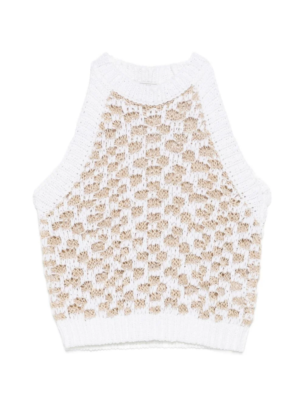 crocheted-construction halterneck top Highlights - White/beige - Crocheted construction - Halter neck - Sleeveless - Ribbed hem - Ribbed trim Made in Italy Composition Cotton 40%, Linen/Flax 22%, Polyamide 19%, Polyester 16%, Metallised Fibres 3% Washing instructions Dry Clean Only