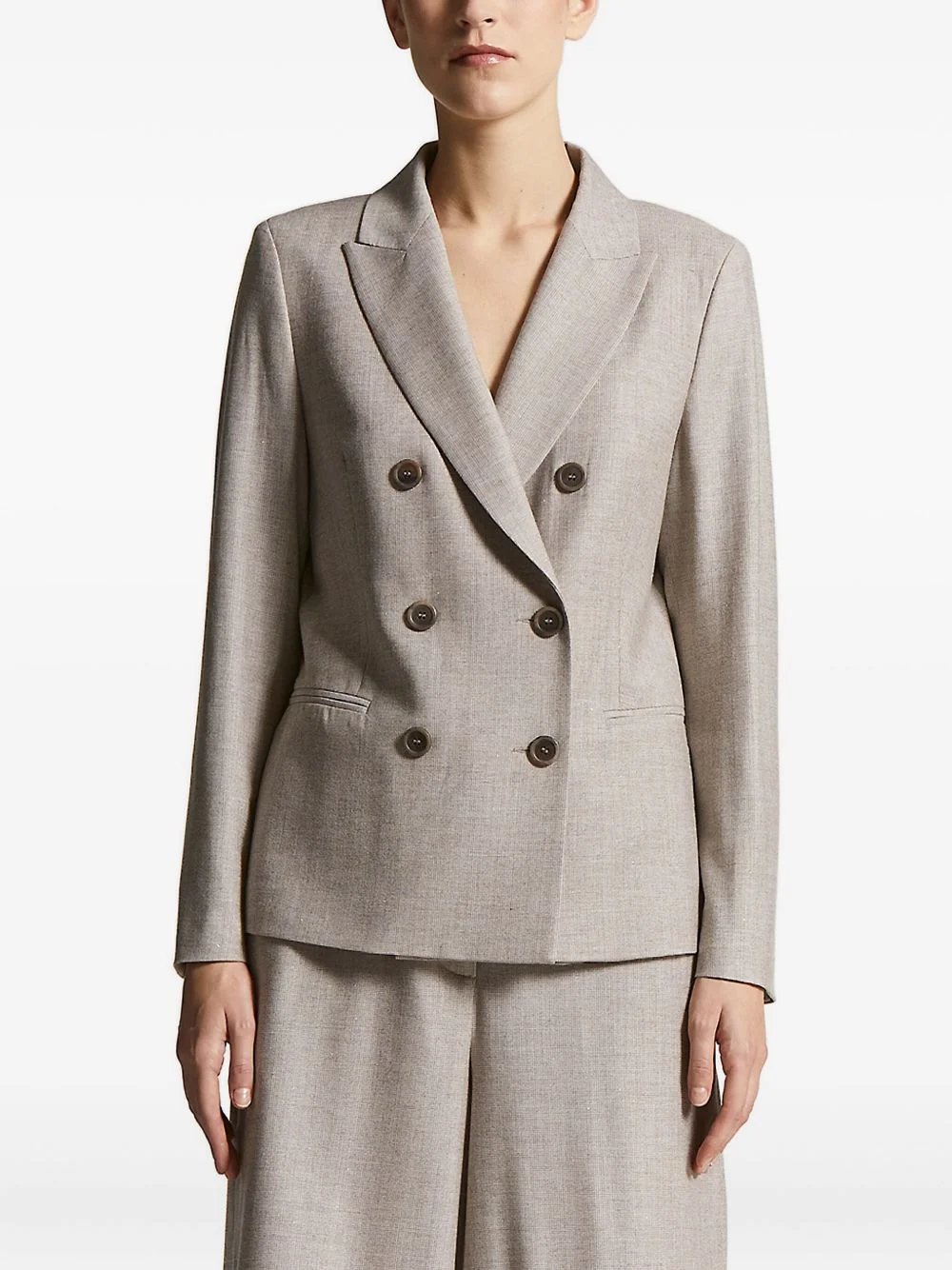 double-breasted blazer Highlights - Beige - Double-breasted fastening - Notched lapel - Textured weave - Long sleeves - Buttoned cuffs Made in Italy Composition Fabric 100% Washing instructions Read Manufacturer Guidelines