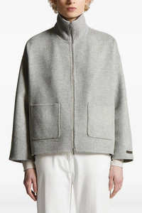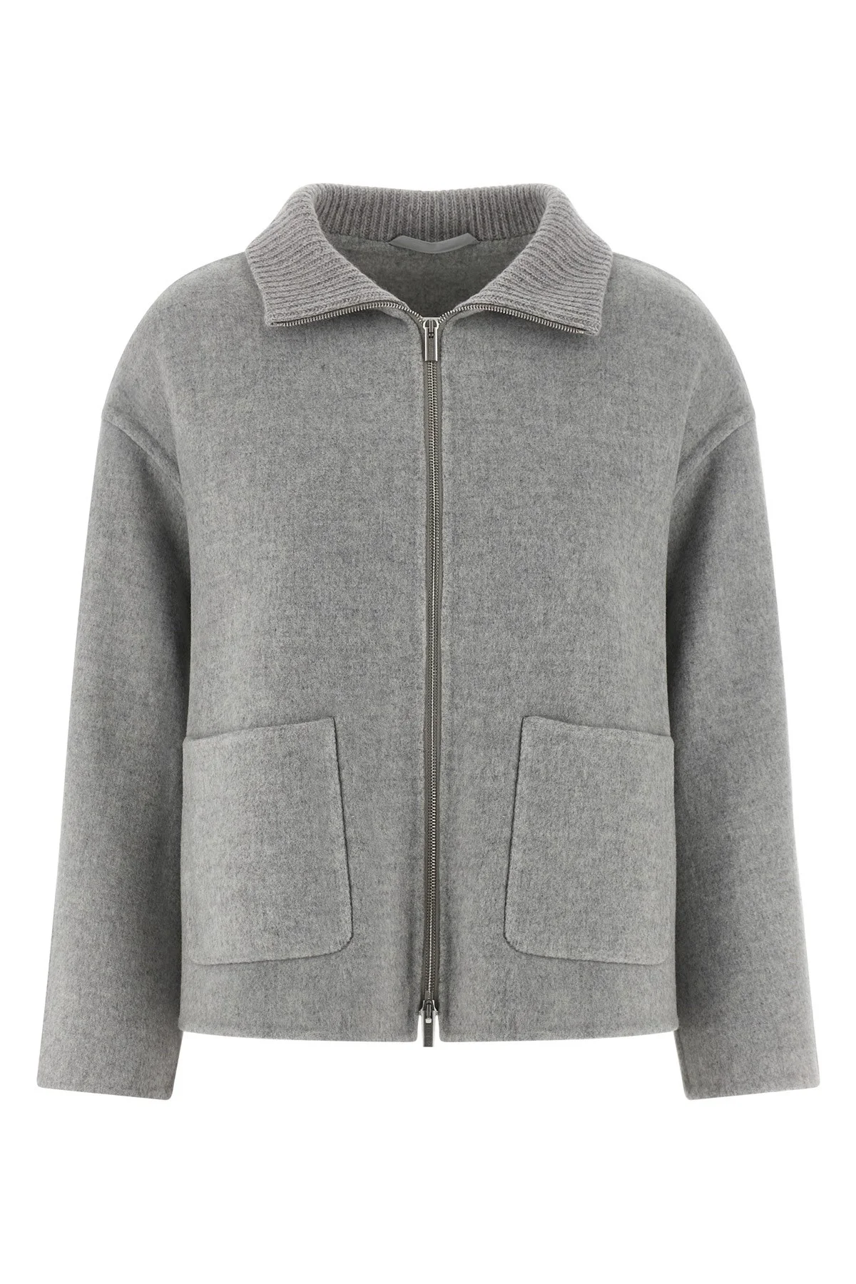cod. A21008F05E3195A76A Double wool and cashmere cloth jacket with ribbed knit details with lame thread, foldable high neck, front zip closure, pockets, long sleeves with dropped shoulders, unlined. Color: Gray Size & Fit: true to size fit Composition: 90% virgin wool 10% cashmere Made in: Italy