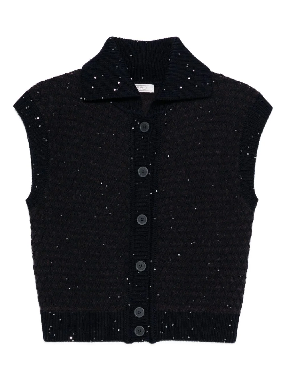 embellished buttoned vest Highlights - Dark blue - Glitter embellishment - Button fastening - Sleeveless - Collared neckline - Textured knit Made in Italy Composition Virgin Wool 86%, Alpaca 8%, Polyamide 5%, Wool 1% SIZE & FIT Model measurements Height 5 ft 10 in(1.78 m) Bust/Chest 33.46 in(85 cm) Hips 36.22 in(92 cm) Waist 23.22 in(59 cm) Washing instructions Hand Wash