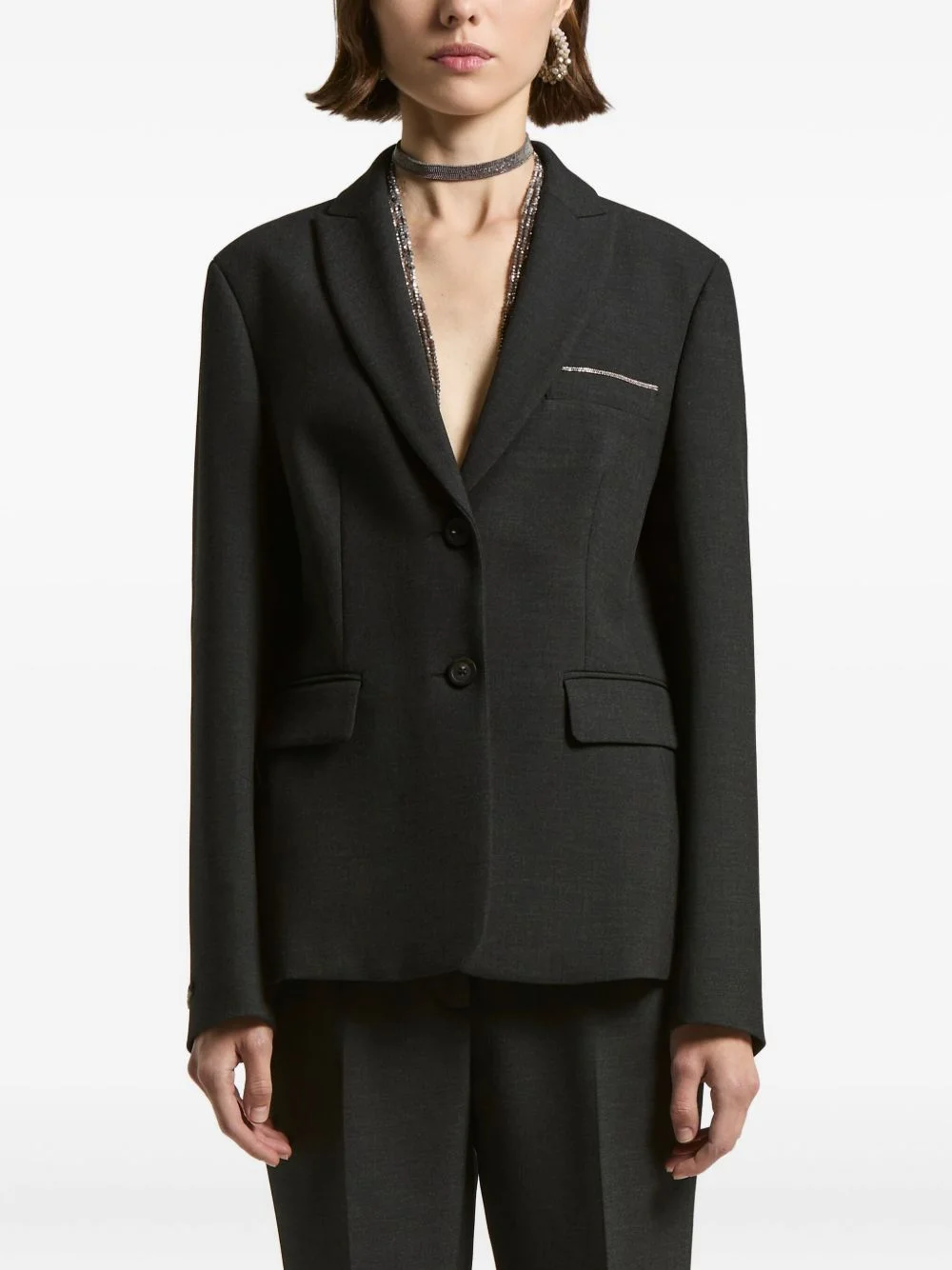embellished pocket blazer Highlights - Grey - Crystal embellishment pocket - Notched lapel - Two button fastening - Long sleeves - Straight hem Made in Italy Composition Fabric 100% Washing instructions Read Manufacturer Guidelines