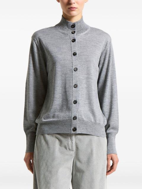 high-neck long-sleeves cardigan Highlights - Olive green - High neck - Button fastening - Long sleeves - Speckled pattern - Ribbed hem Made in Italy Composition Fabric 100% Washing instructions Read Manufacturer Guidelines