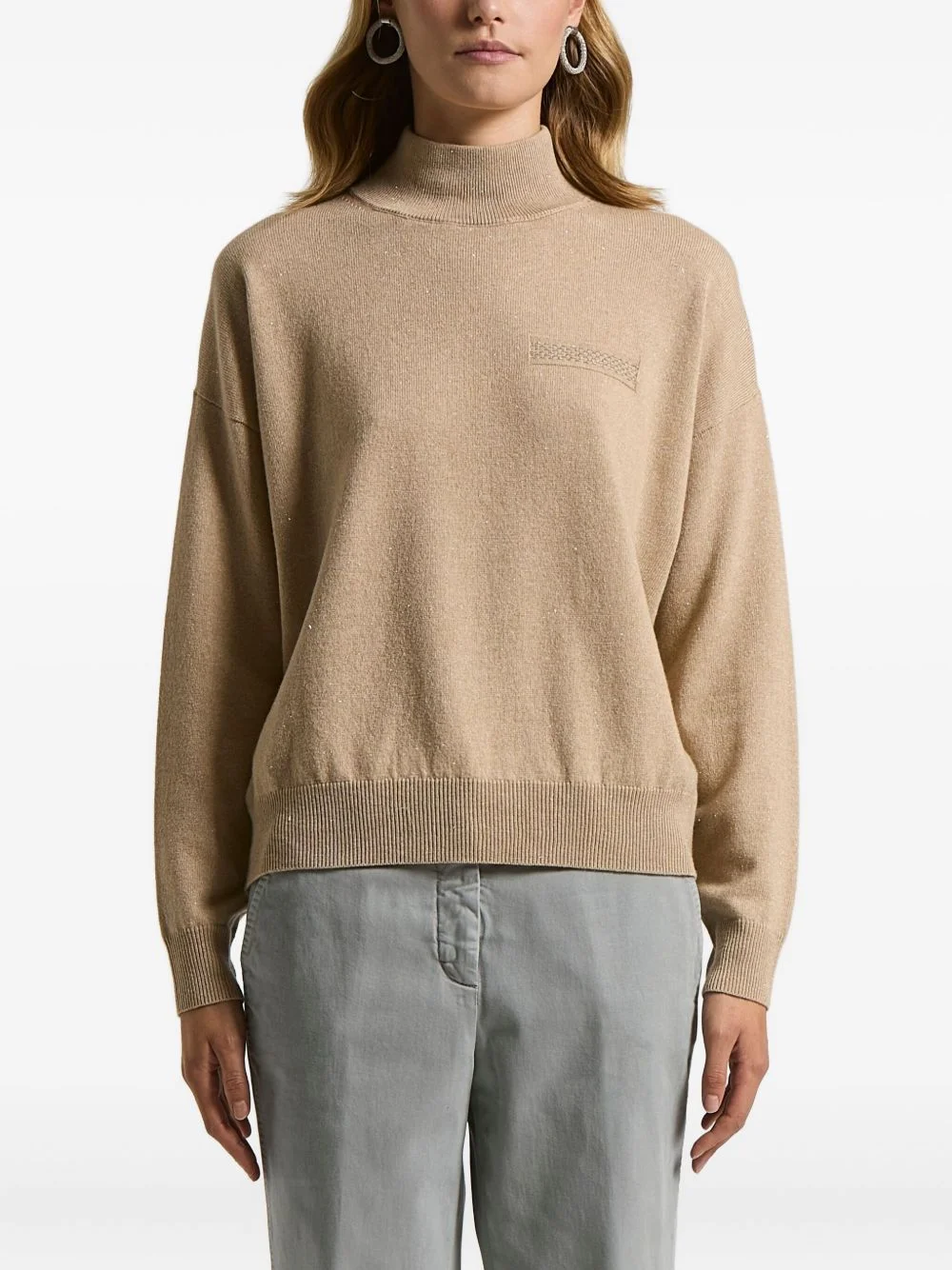 high-neck pocket sweater Highlights - Beige - High neck - Chest pocket - Ribbed hem - Ribbed cuffs - Long sleeves Made in Italy Composition Virgin Wool 60%, Silk 17%, Viscose 13%, Cashmere 9%, Polyester 1% Washing instructions Read Manufacturer Guidelines