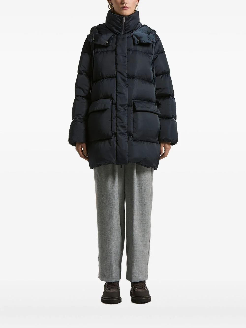 hooded padded coat Highlights - Midnight blue - Padded design - Hood - Front patch pockets - Zip fastening - Long sleeves Made in Italy Composition Outer: Polyester 100% Lining: Goose Down 90%, Goose Feather 10% Washing instructions Read Manufacturer Guidelines