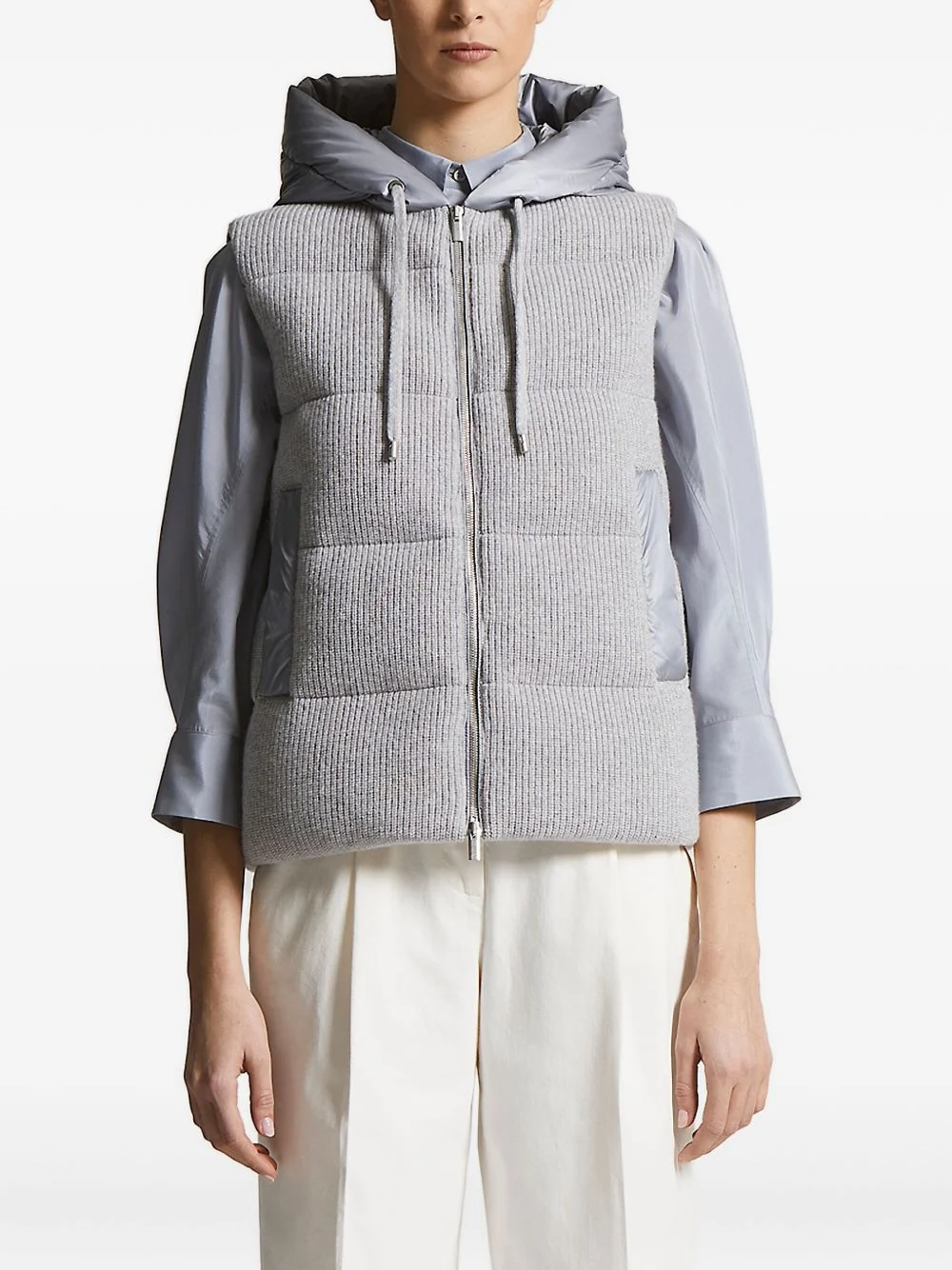 hooded quilted padded jacket Highlights - Grey - Quilted design - Hooded neckline - Zip fastening - Knit body Made in Italy Composition Polyamide 100%, Wool 70%, Viscose 20%, Cashmere 10% Washing instructions Read Manufacturer Guidelines