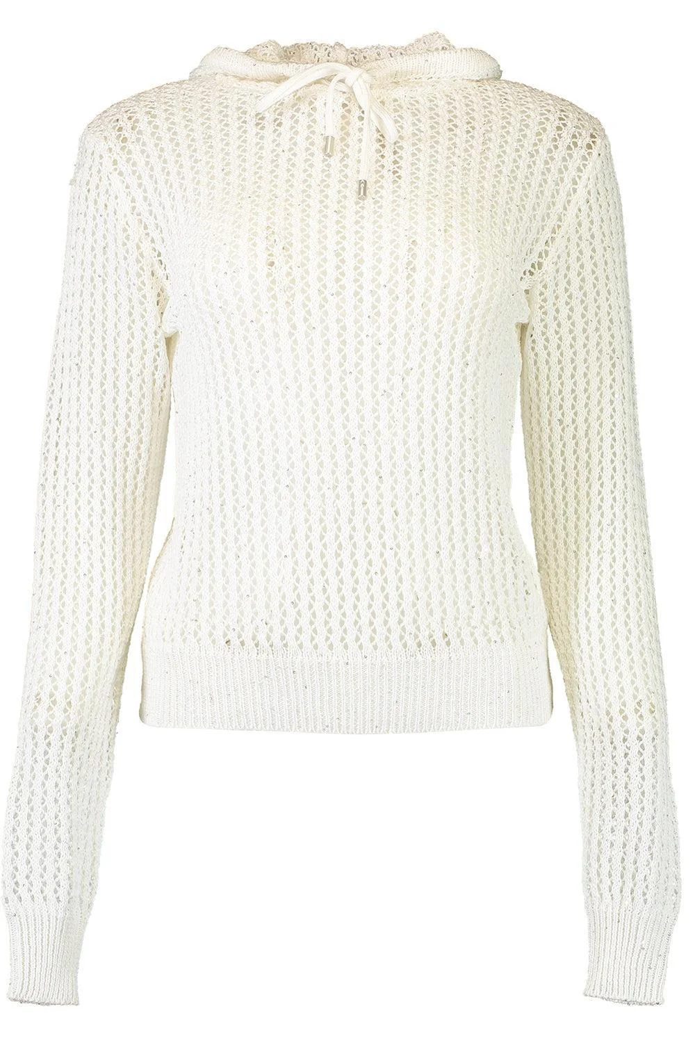 DETAILS AND INSIGHT Peserico hooded sweater in cloud white. Mercerized pure cotton cordonnet, microsequins Dry Clean Imported Style S99778F05-A9110-A02