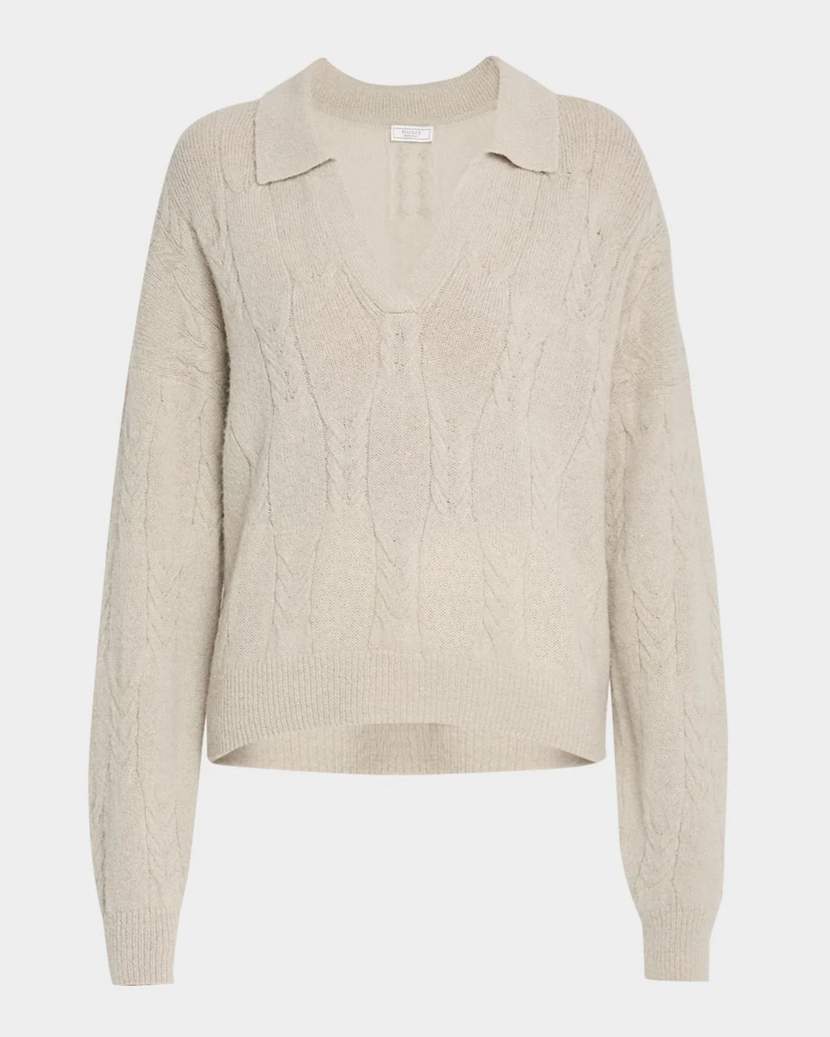 Peserico cable knit sweater defined by a Johnny collar and Vneckline Approx. 20.86"L from shoulders to hem Drop shoulders Long sleeves; approx. 18.9"L Ribbed cuffs and hem Relaxed fit Pullover style Wool/nylon Unlined Dry clean, hand wash Made in Italy