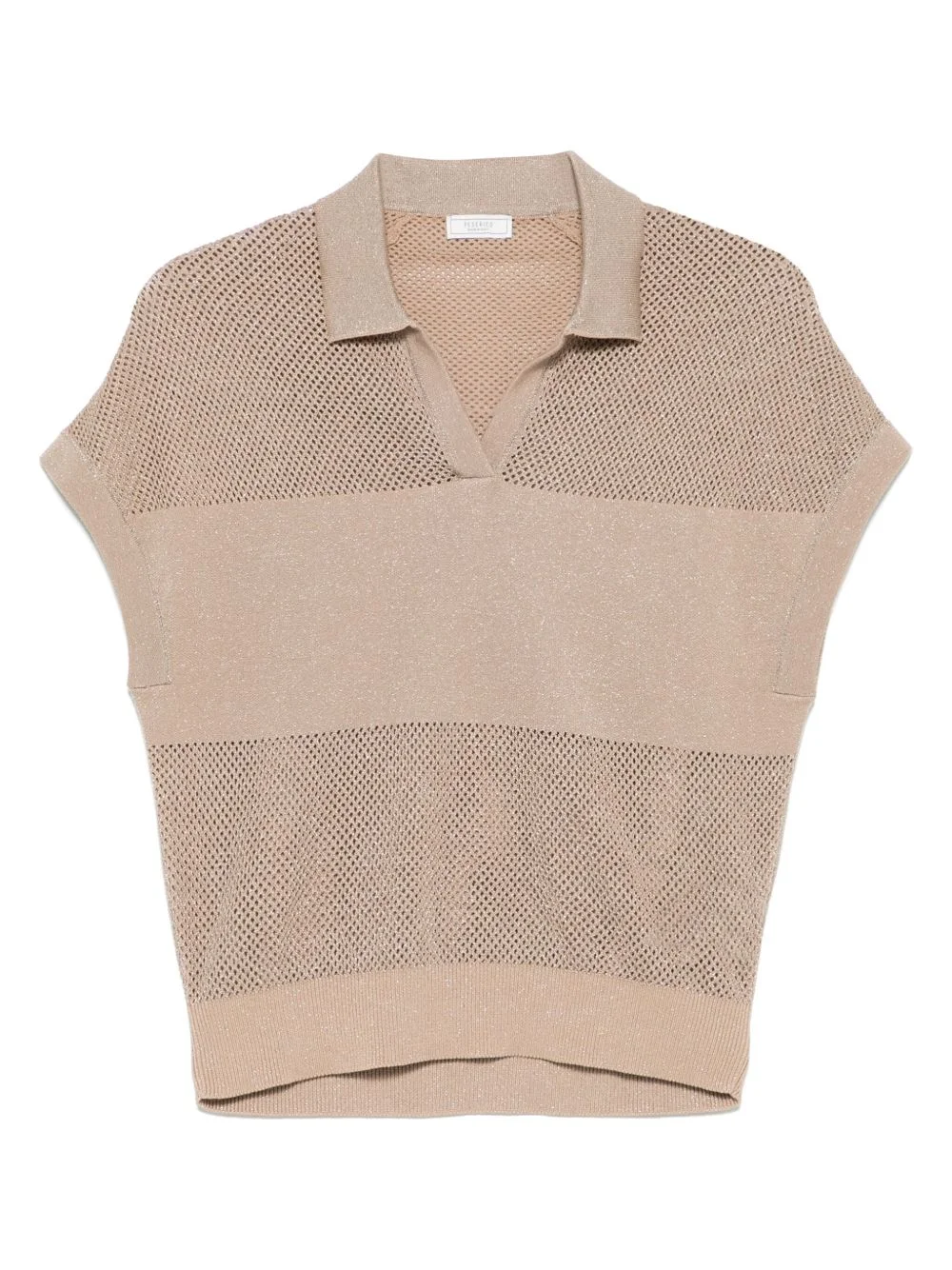 lurex-embellished polo top Highlights - Earth brown - V-neck - Cap sleeves Made in Italy Composition Cotton 70%, Viscose 24%, Other fibres 6% SIZE & FIT Model measurements Height 5 ft 9 in(1.75 m) Bust/Chest 31.88 in(81 cm) Hips 34.64 in(88 cm) Waist 24.01 in(61 cm) FittingInformation Designed for a relaxed fit, this piece allows for comfort and movement when worn Made with a midweight knit, this piece offers some stretch Washing instructions Dry Clean Only