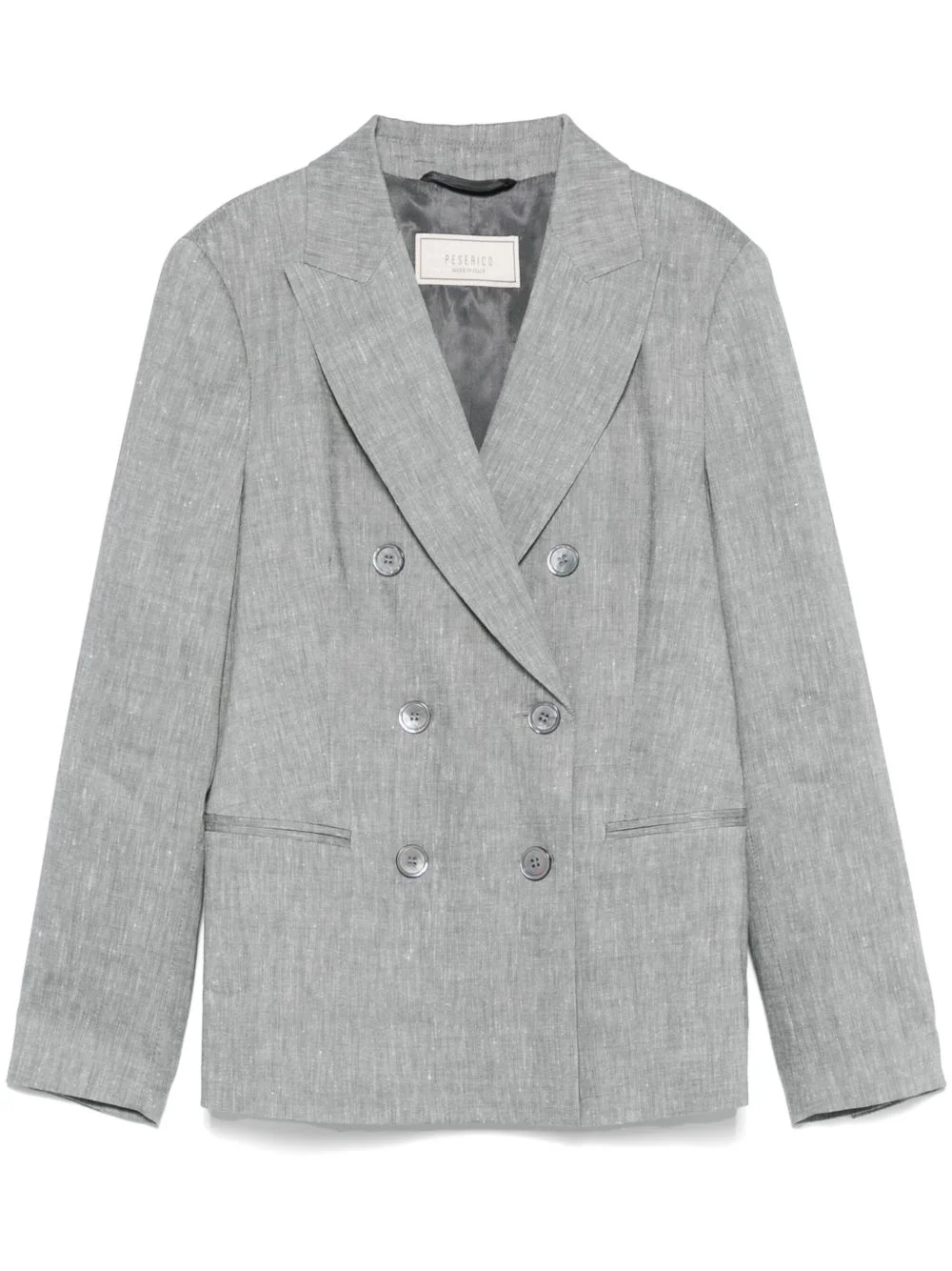 peak-lapels blazer Highlights - Light grey - Double-breasted button fastening - Buttoned-cuff sleeves - Two front jetted pockets - Full lining Made in Italy Composition Outer: Linen/Flax 56%, Virgin Wool 44% Lining: Viscose 100% SIZE & FIT Model measurements Height 5 ft 11 in(1.8 m) Bust/Chest 31.49 in(80 cm) Hips 36.61 in(93 cm) Waist 24.4 in(62 cm) FittingInformation Designed for a slim fit that sits just away from the body offering a close yet comfortable fit The internal shoulder pads offer a structured shape Made from a midweight non-stretch fabric Washing instructions Dry Clean Only