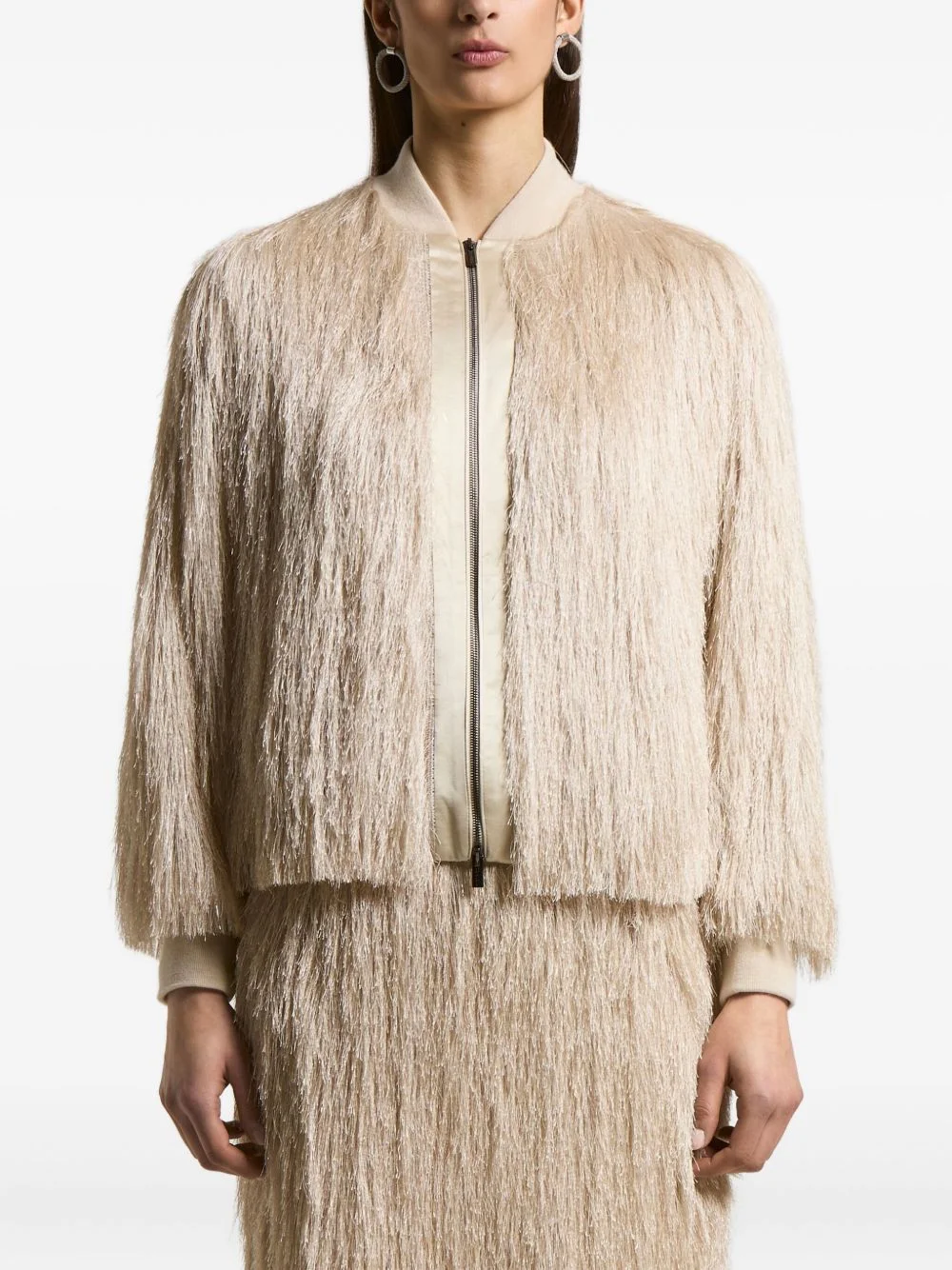fringed bomber jacket Highlights - Beige - Fringe detail - Two-way zip fastening - Long sleeves - Ribbed cuffs Made in Italy Composition Fabric 100% Washing instructions Read Manufacturer Guidelines