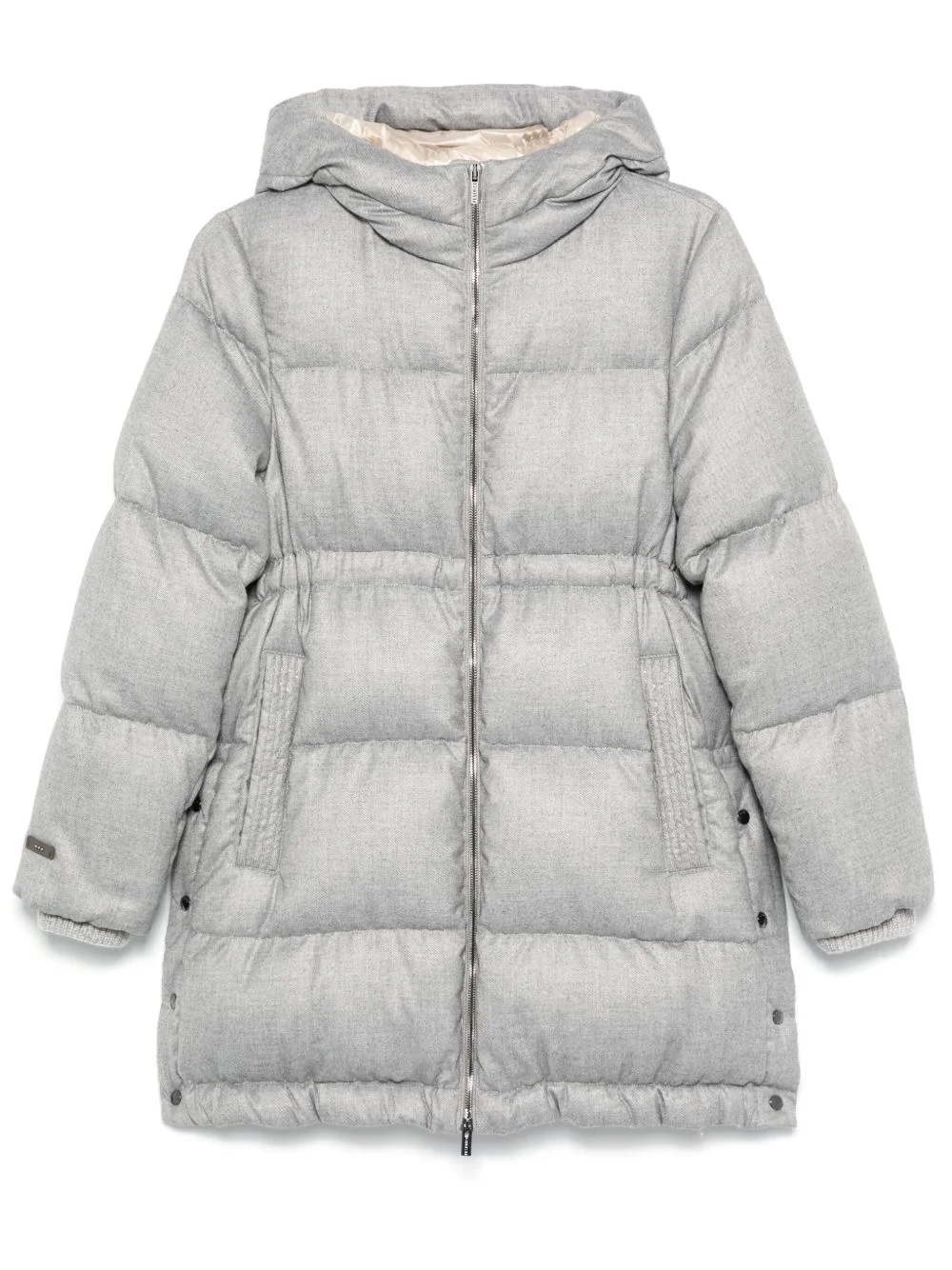 Punto Luce-chain coat Highlights - Light grey - Down-feather filling - Twill weave - Padded design - Quilted - Front two-way zip fastening - High neck - Drawstring hood - Long sleeves - Ribbed cuffs - Two side welt pockets - Punto luce-chain detail - Side slits - Press-stud fastening - Straight hem Made in Italy Composition Lining: Nylon 100%, Goose Down 90%, Goose Feather 10% Outer: Leather 100%, Polyester 70%, Viscose 30% SIZE & FIT Model measurements Height 5 ft 10 in(1.77 m) Bust/Chest 30.7 in(78 cm) Hips 35.03 in(89 cm) Waist 23.62 in(60 cm) FittingInformation Designed for a slim fit that sits just away from the body offering a close yet comfortable fit The adjustable drawstring means that you can adjust this piece’s fit to suit your comfort and preference Made from a padded non-stretch fabric, giving it no natural elasticity Washing instructions Machine Wash