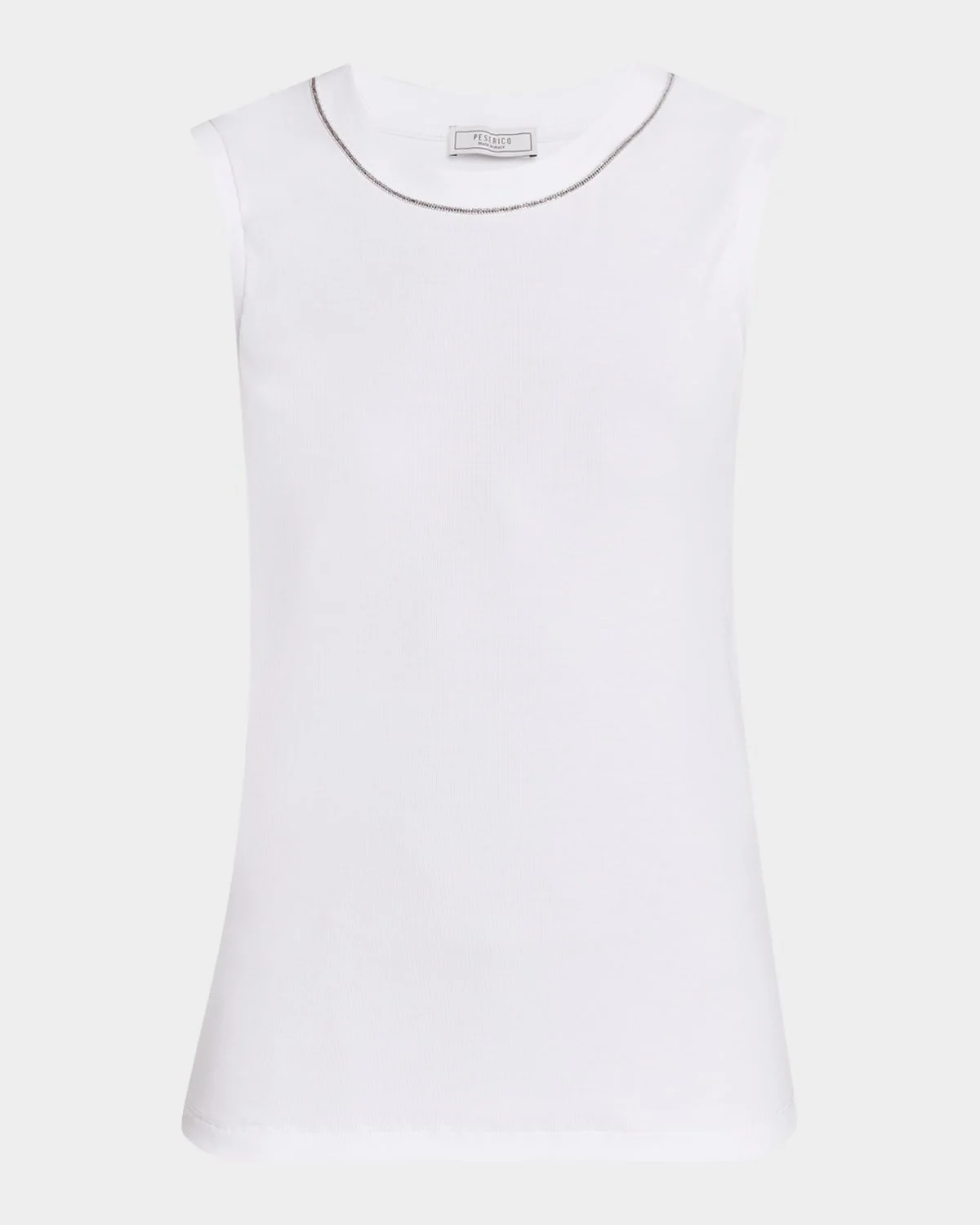 Peserico fine ribbed knit top embellished with signature Punto Luce trim Approx. 25"L from shoulders to hem Crew neckline Sleeveless Slim fit Pullover style Cotton/elastane Unlined Machine wash Made in Italy