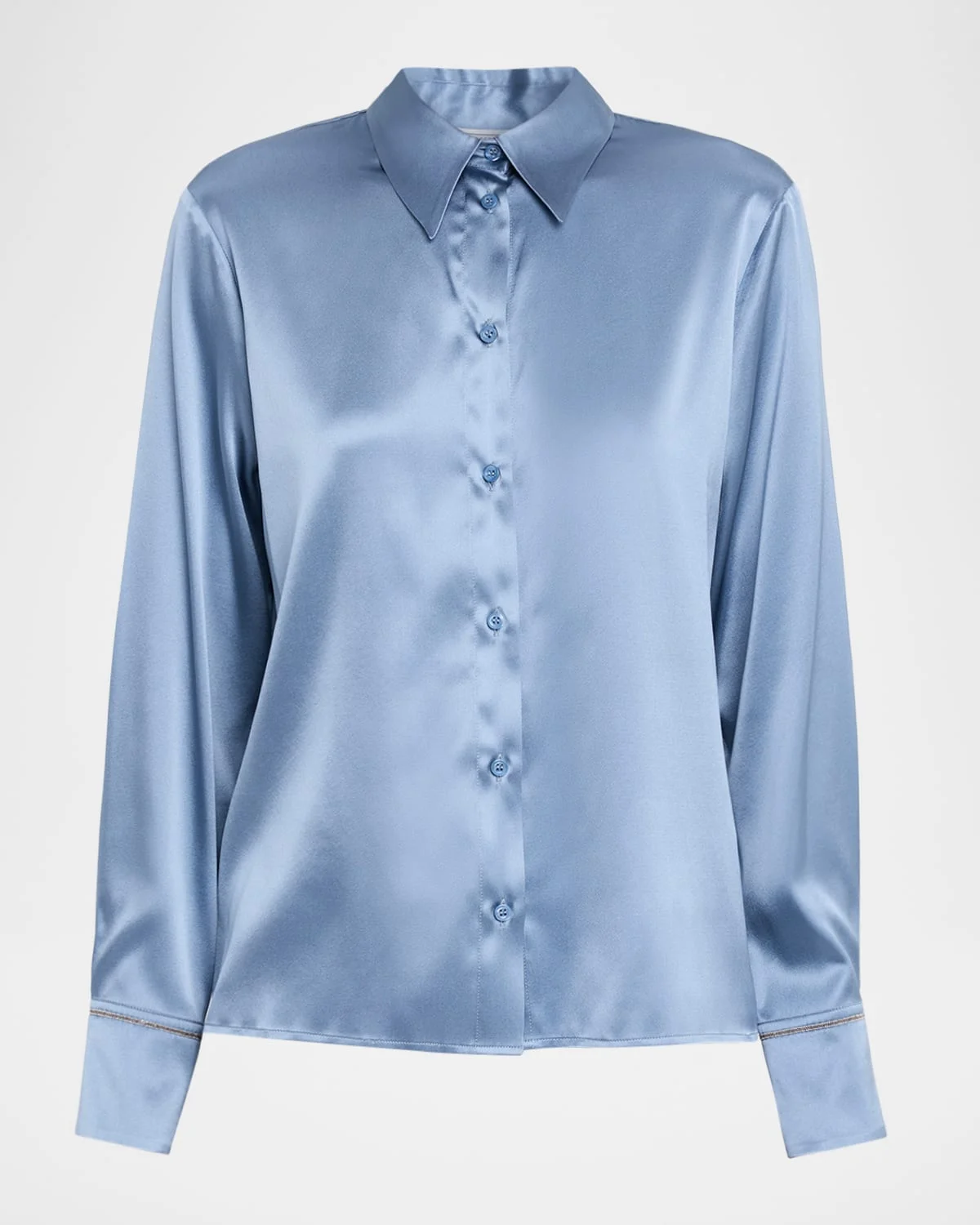 Made in a silk blend, this Peserico shirt is finished with shimmering signature Punto Luce trim on the cuffs Approx. 24.5"L from shoulders to hem Point collar; button front Long sleeves; approx. 20.5"L Button cuffs Relaxed fit Silk/elastane Unlined Machine wash Made in Italy