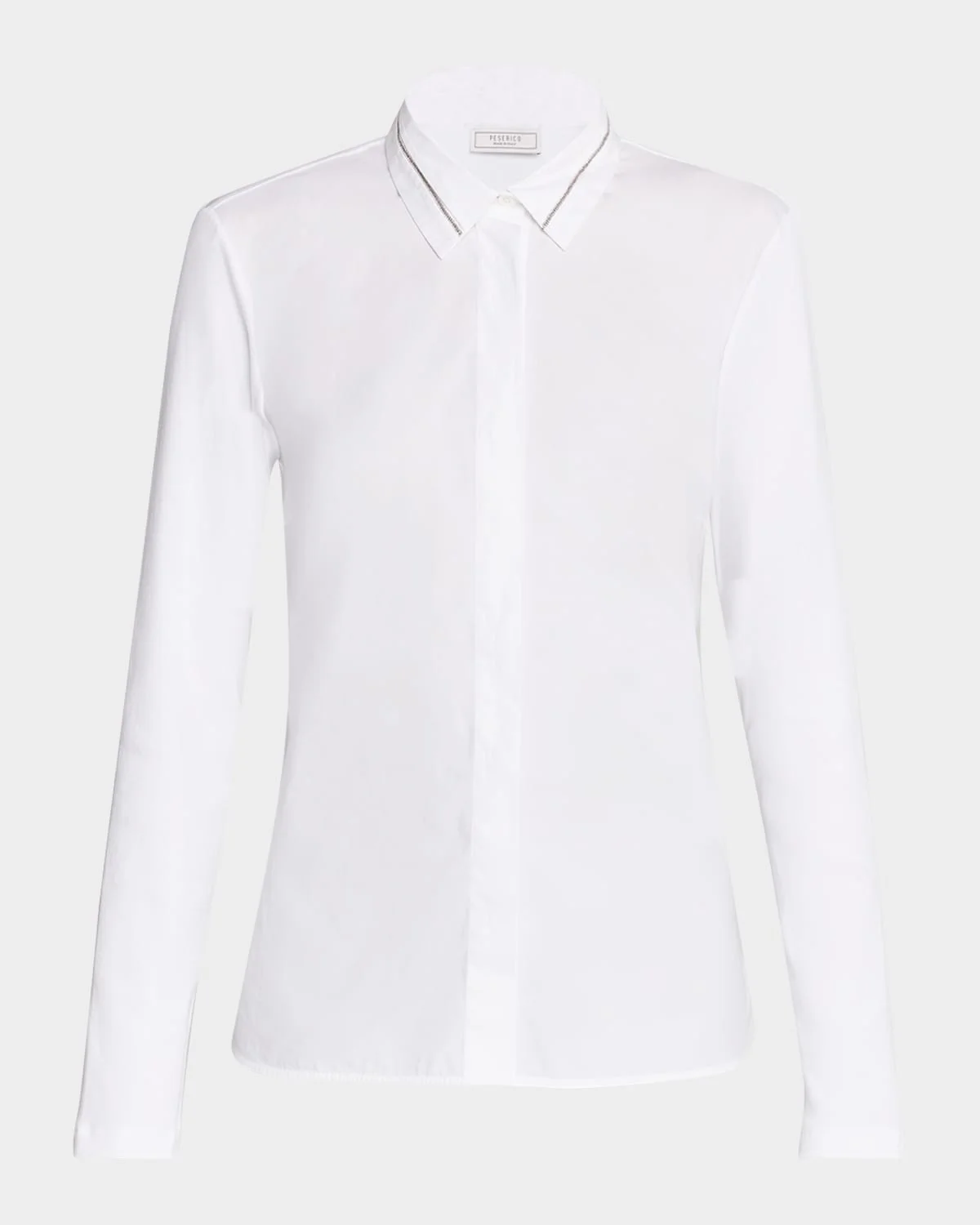 Peserico shirt embellished with signature Punto Luce trim Approx. 25.5"L from shoulders to hem Point collar; concealed button front Long sleeves; approx. 23.5"L Slim fit Cotton/elastane Unlined Machine wash Made in Italy