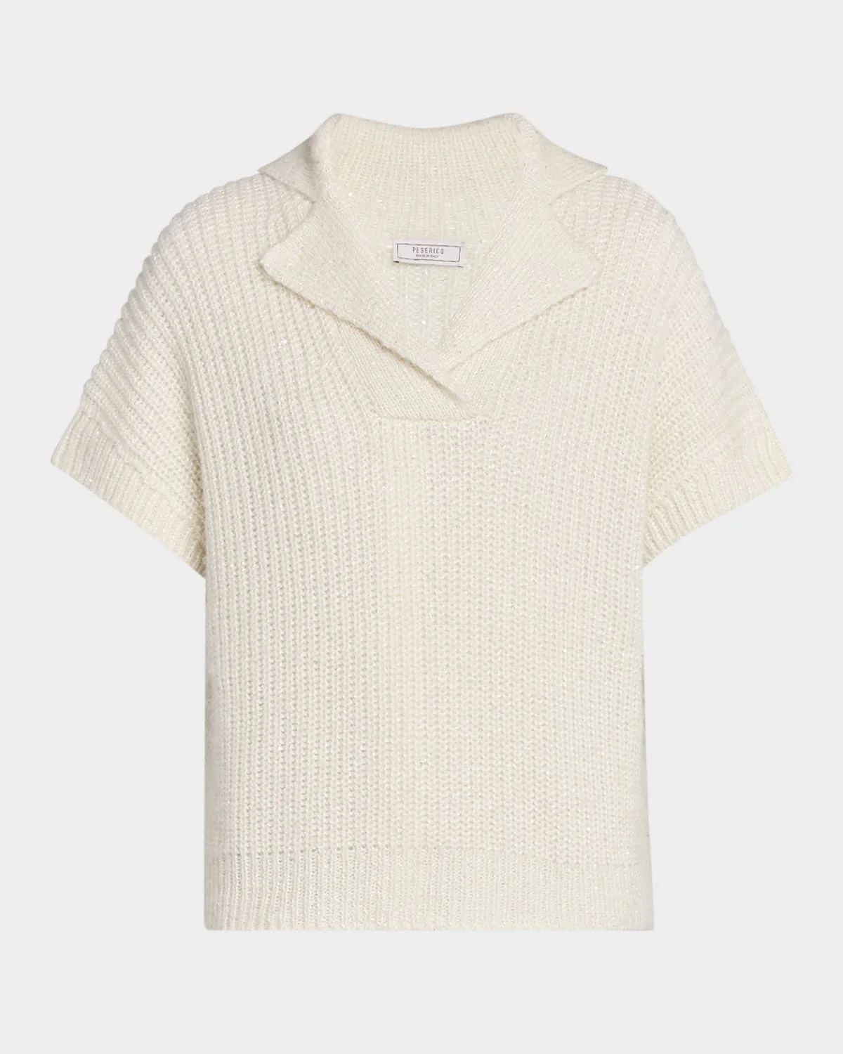Peserico ribbed vest knit in shimmer metallic yarn Sparkles with sequin embellishments Approx. 21"L from shoulders to hem Notched lapels Short sleeves Relaxed fit Pullover style Wool/nylon/polyamide Unlined Dry clean, hand wash Made in Italy