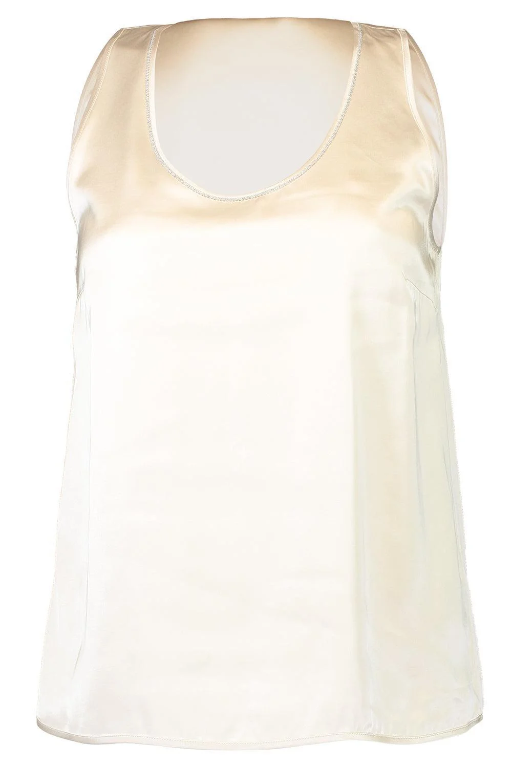 DETAILS AND INSIGHT Perserico tank top in beige birch. 100% Viscose Dry Clean Made In Italy Style A08481-BEIGE BIRCH