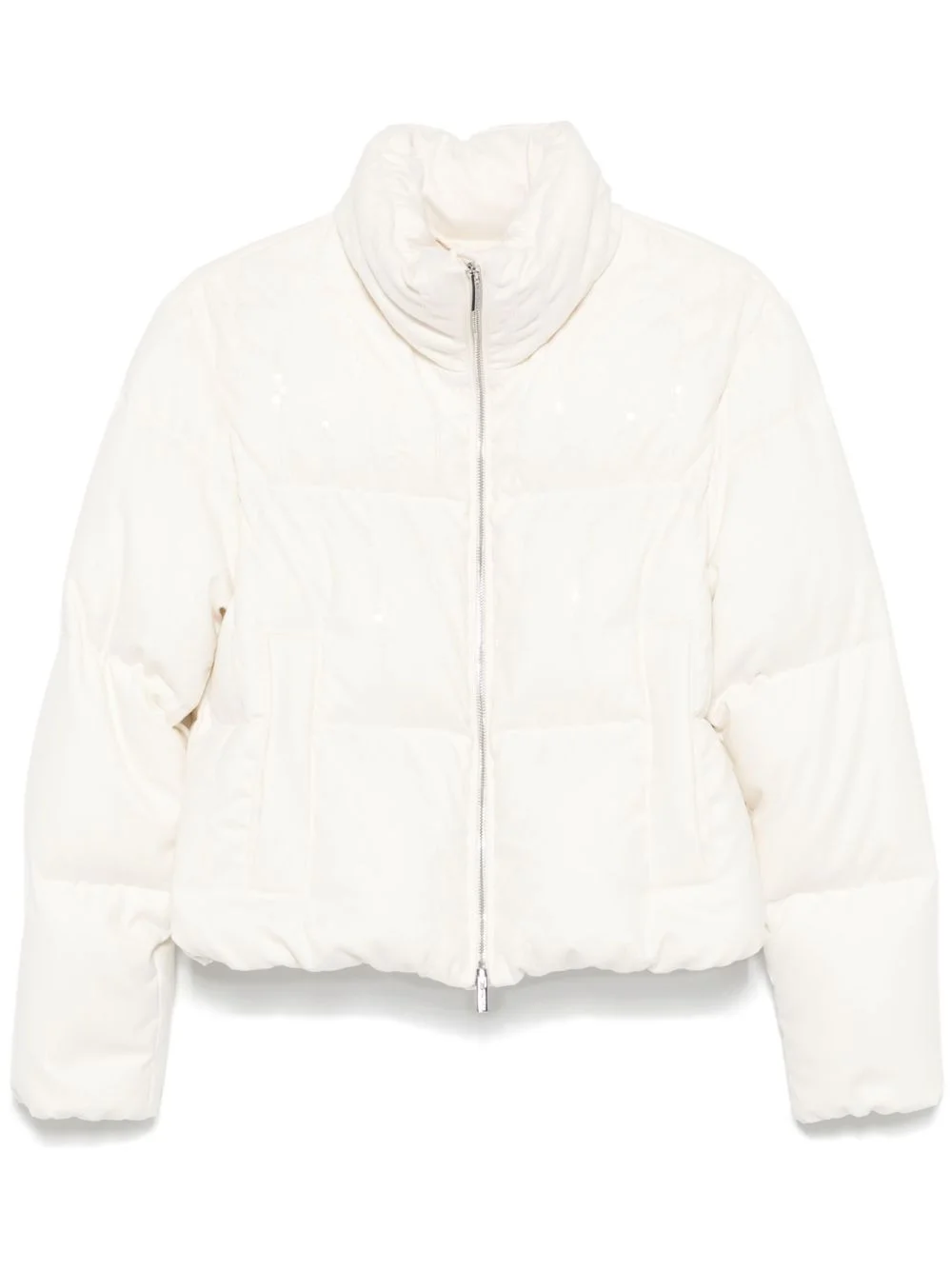 sequin-detailing jacket Highlights - White - Down-feather filling - Twill weave - Quilted - Padded design - Front two-way zip fastening - High neck - Long sleeves - Elasticated cuffs - Sequin detailing - Two side stud-fastening pockets - Internal patch pockets - Elasticated hem - Full lining Made in Italy Composition Outer: Polyester 83%, Viscose 16%, Elastane 1% Lining: Goose Down 90%, Goose Feather 10% SIZE & FIT Model measurements Height 5 ft 10 in(1.77 m) Bust/Chest 32.28 in(82 cm) Hips 35.03 in(89 cm) Waist 25.19 in(64 cm) FittingInformation Designed for a relaxed fit, this piece allows for comfort and movement when worn Made from a padded stretch fabric, giving it elasticity and a flexible fit Washing instructions Machine Wash