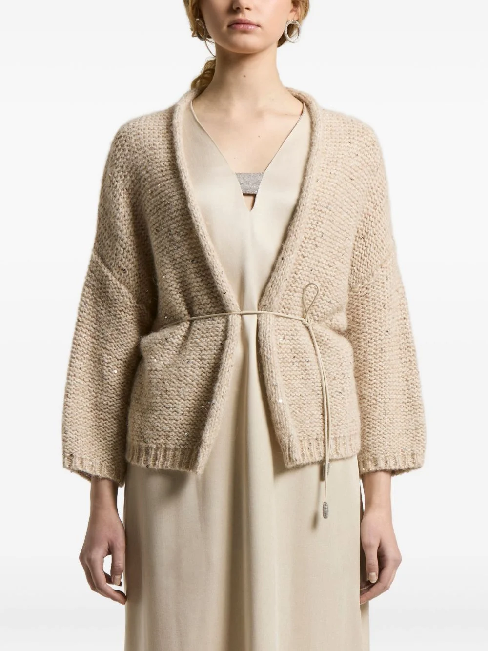 sequin-embellished belted cardigan Highlights - Beige - Sequin embellishment - Belted waist - Open front - Three-quarter sleeves - Relaxed fit Made in Italy Composition Fabric 100% Washing instructions Read Manufacturer Guidelines