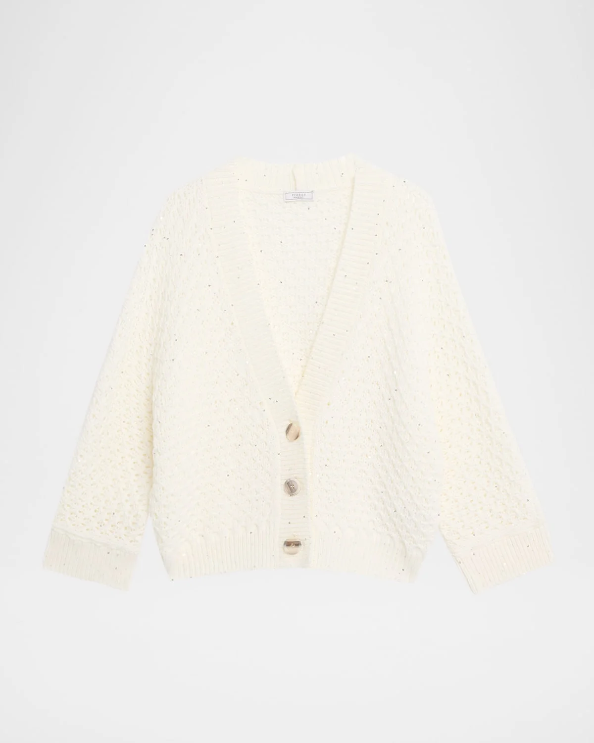 Peserico textured knit cardigan in virgin wool shimmers with lightcatching sequins Approx. 19"L from shoulders to hem V neckline; button front Long sleeves Relaxed fit Virgin wool Unlined Dry clean, hand wash Made in Italy