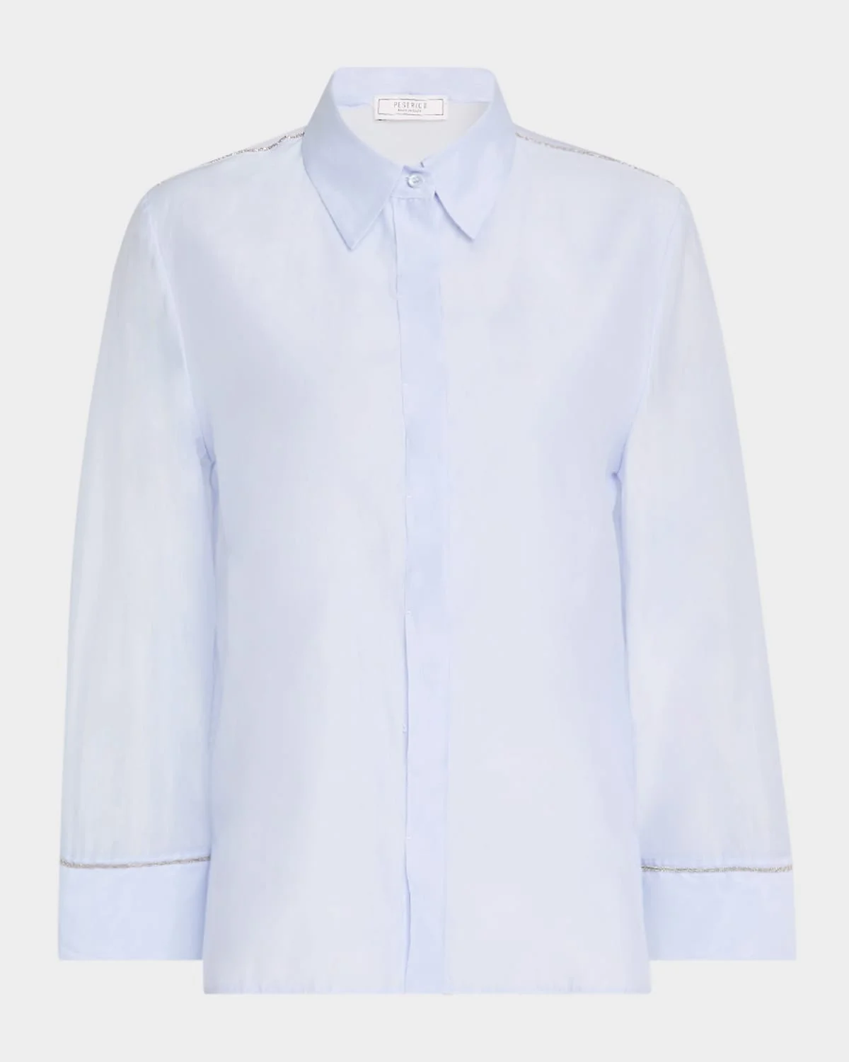 Peserico semisheer shirt with signature chain trim Point collar Concealed button front 3/4 sleeves Hem side slits Relaxed fit Cotton/silk Unlined Dry clean Made in Italy