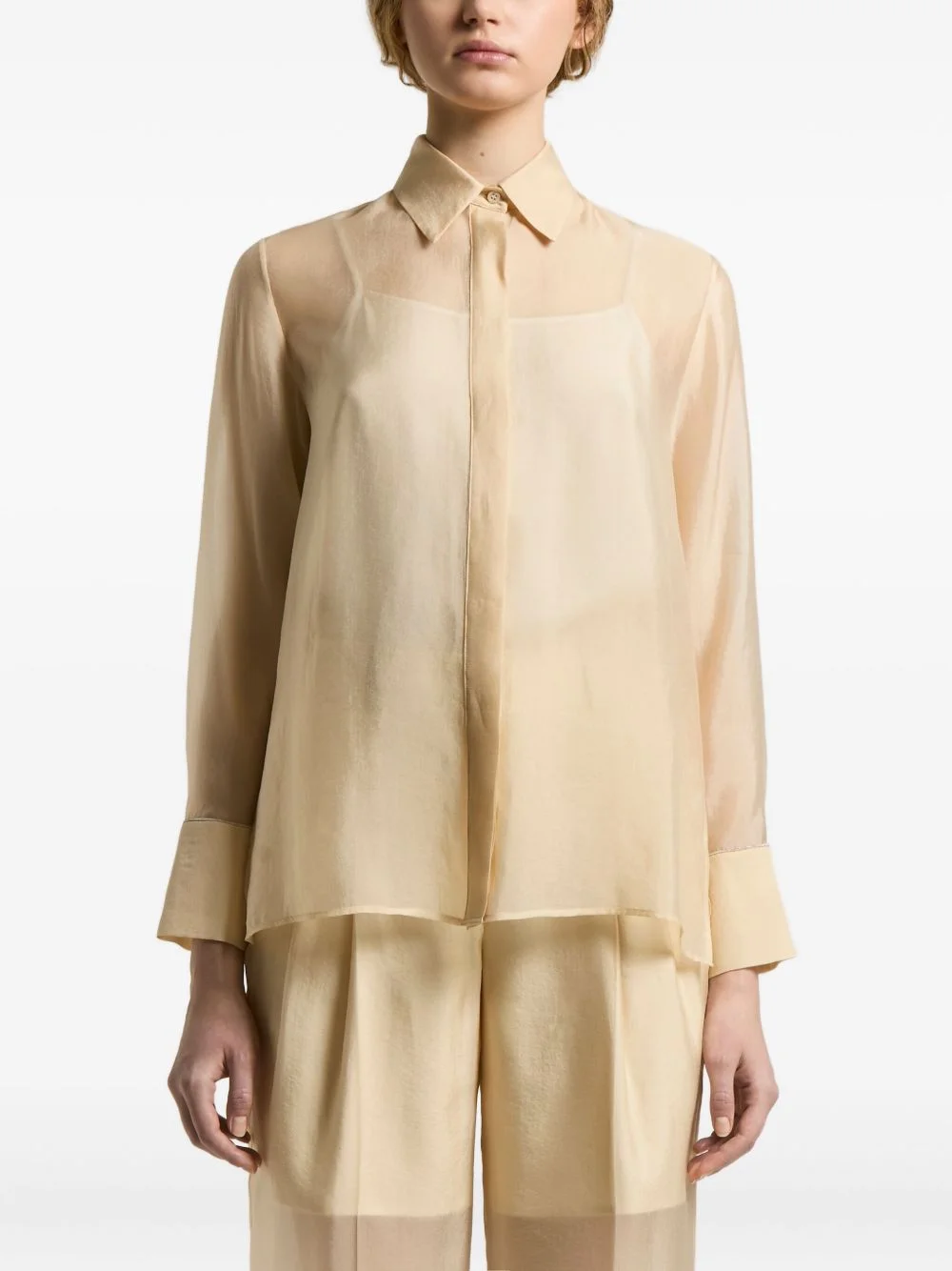 sheer-panel collared shirt Highlights - Ivory - Sheer panel - Collared neck - Long sleeves - Button fastening - Straight hemline Made in Italy Composition Fabric 100% Washing instructions Read Manufacturer Guidelines