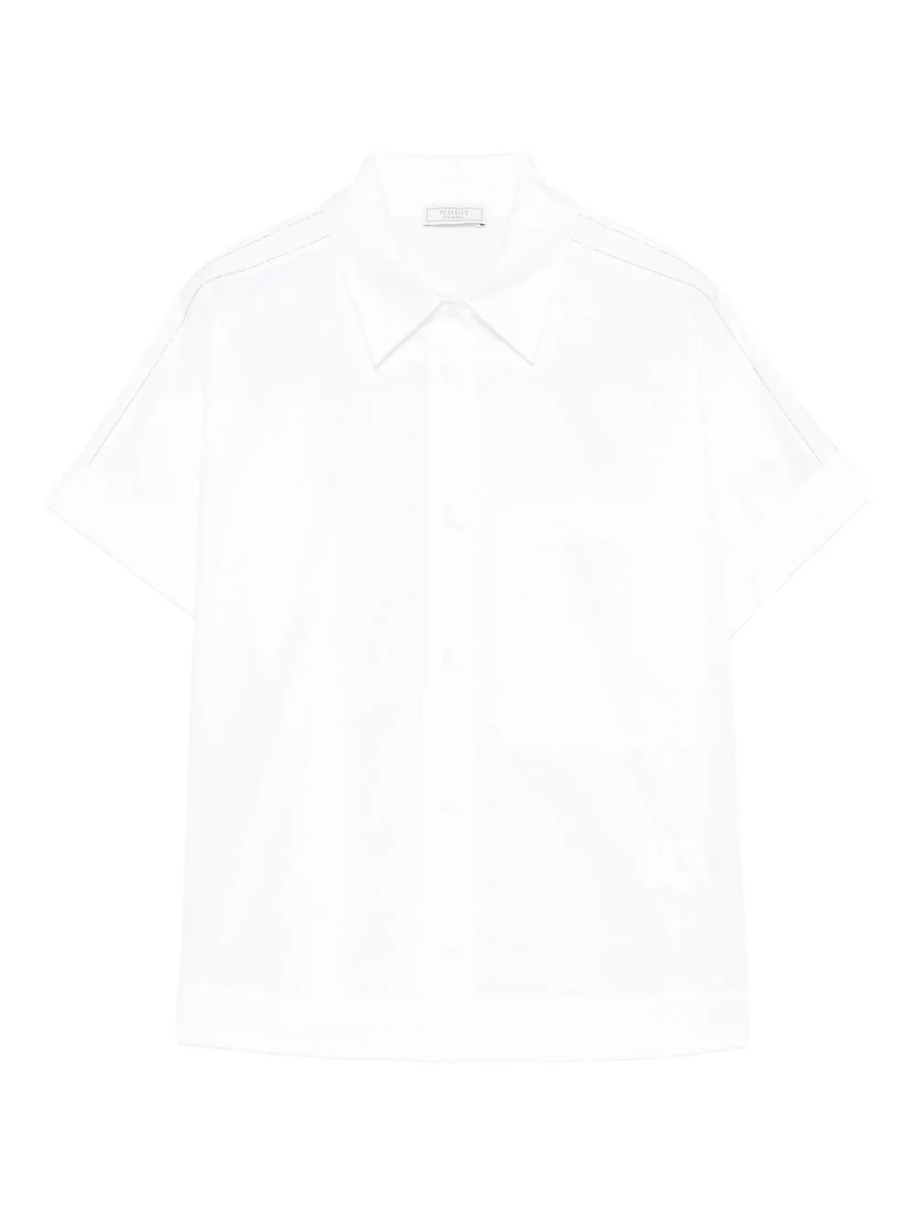 short-sleeve skirt Highlights - Natural white - Short-sleeve - Classic collar - Button fastening - Top stitching Made in Italy Composition Cotton 97%, Elastane 3% Washing instructions Machine Wash