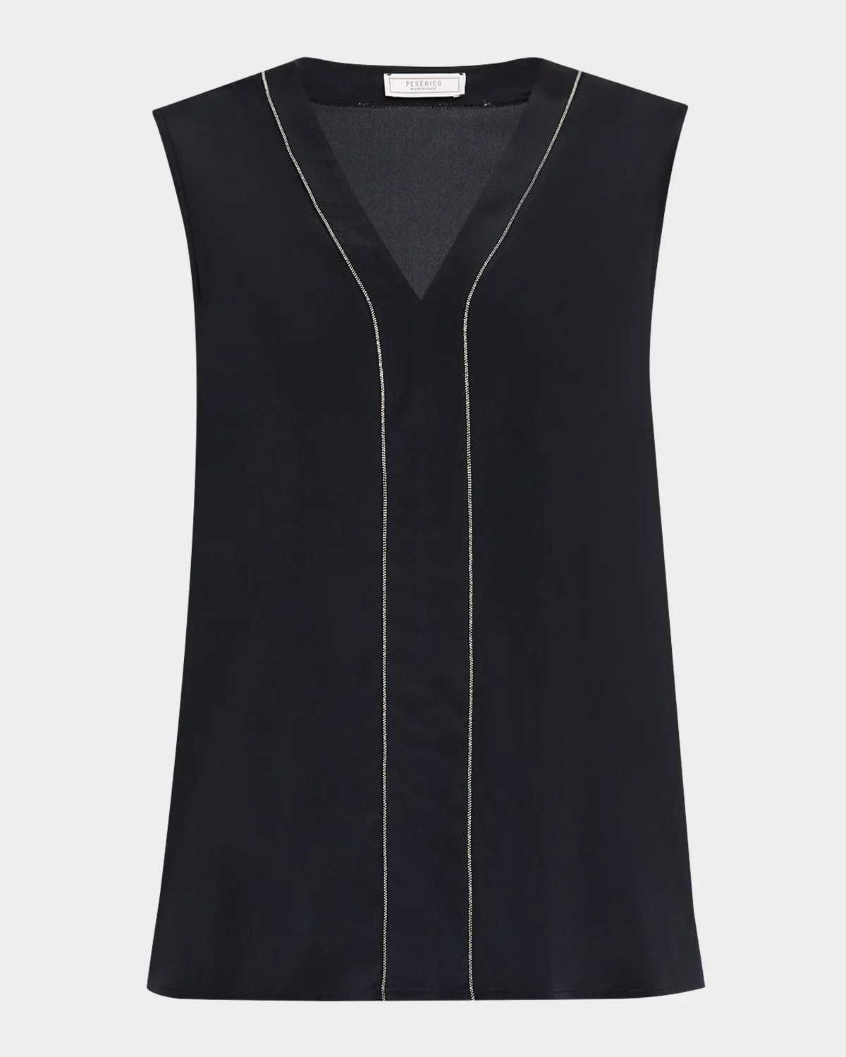 Peserico top with signature chain trim Approx. 25.5"L from shoulders to hem V neckline Sleeveless Relaxed fit Pullover style Silk/elastane Unlined Machine wash Made in Italy