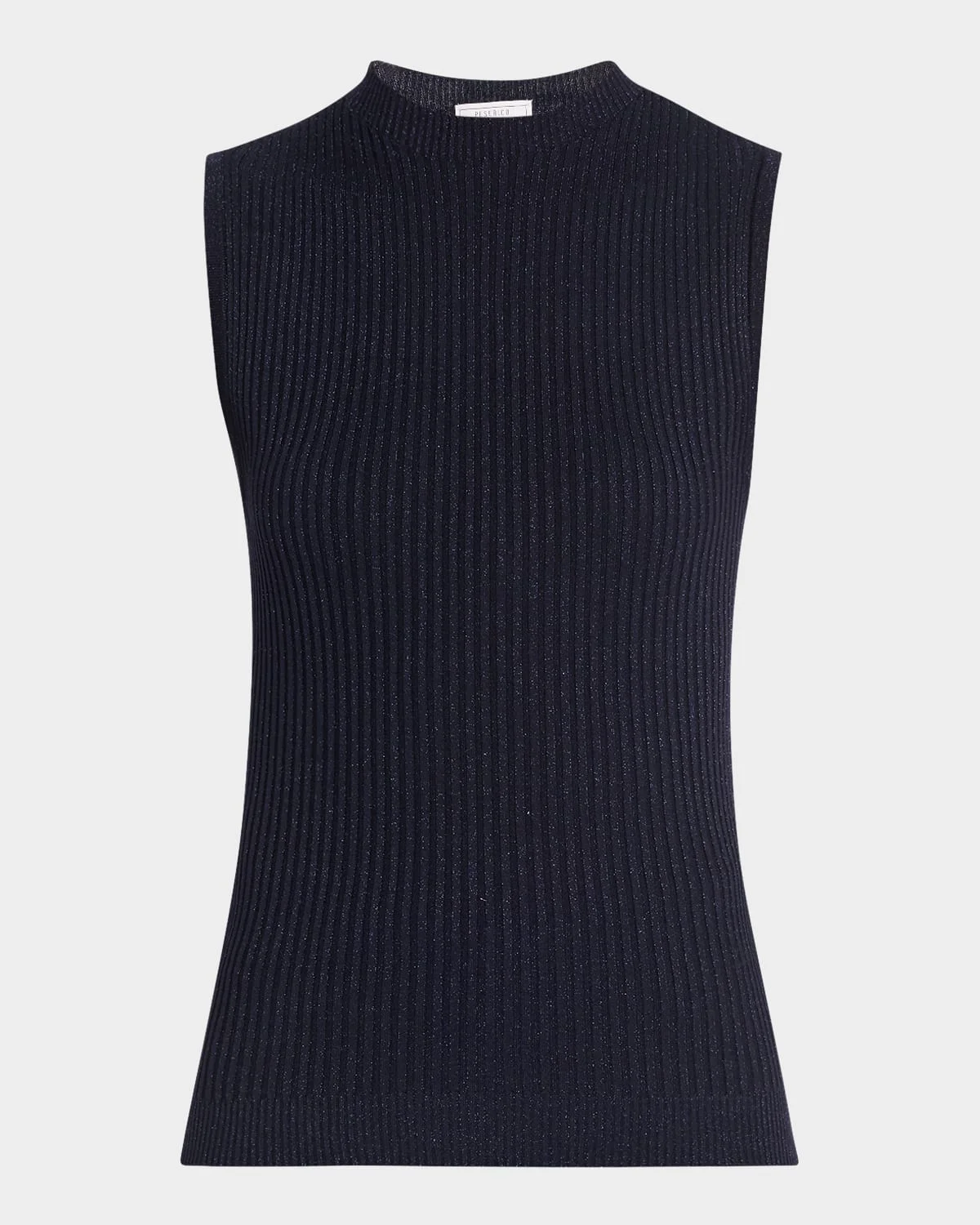 Peserico top in a ribbed knit Approx. 23"L from shoulders to hem High neckline Sleeveless Slim fit Pullover style Viscose/nylon/polyamide/metallic fibers Unlined Dry clean, hand wash Made in Italy