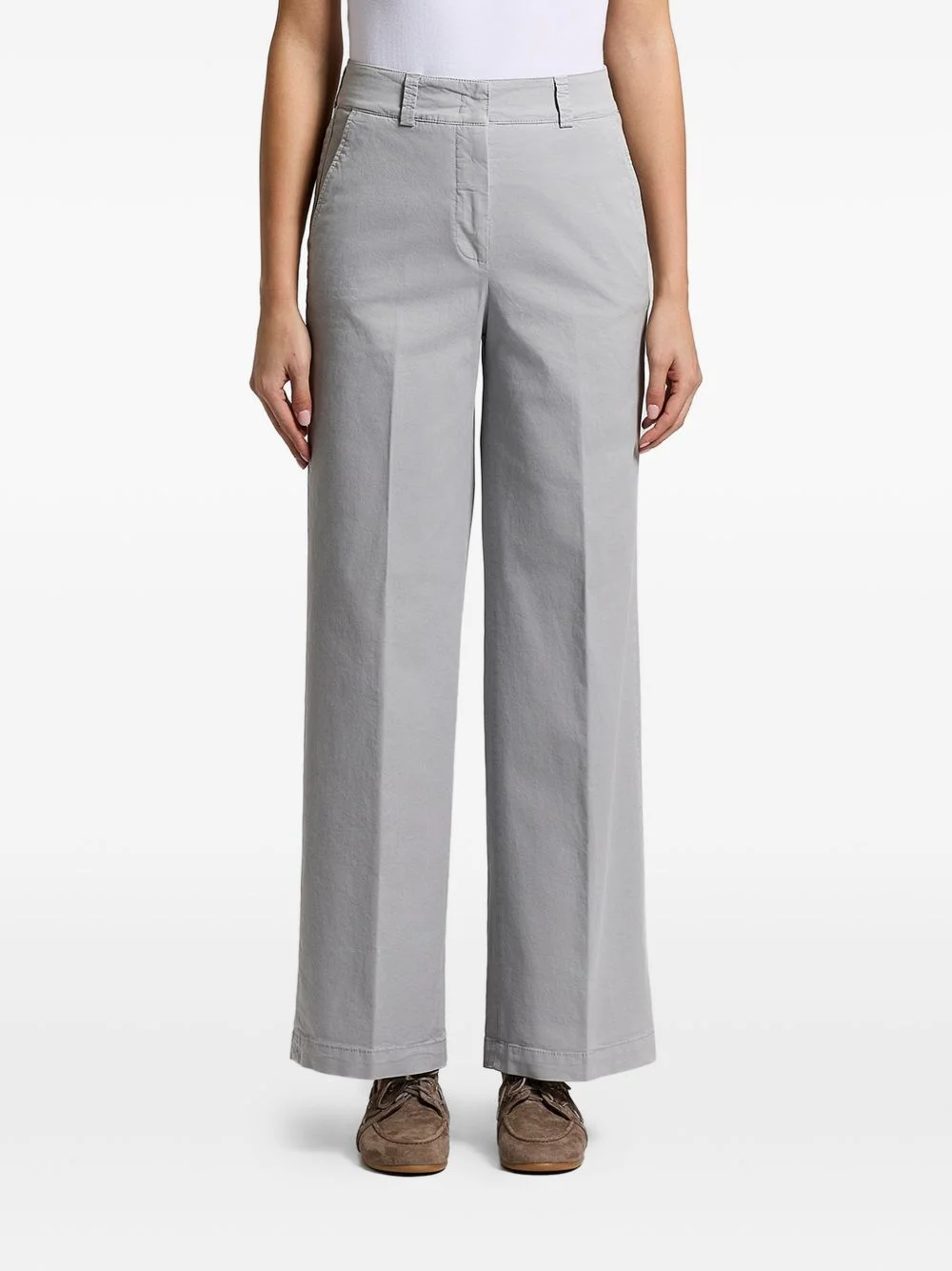 stonewash gabardine trousers Highlights - Pearl grey - Belt loops - Rear flap pockets - Side seam pockets - Concealed front fastening - Straight leg Made in Italy Composition Cotton 98%, Elastane 2% Washing instructions Read Manufacturer Guidelines