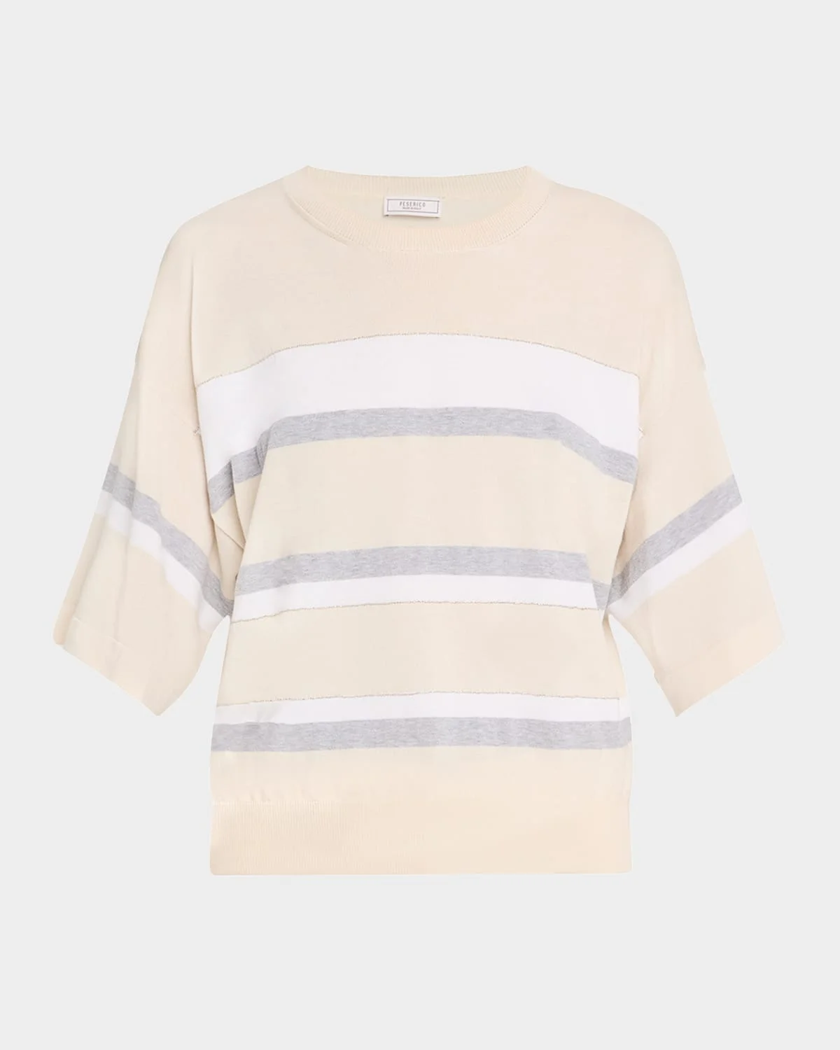 Peserico knit sweater with stripes and signature chain trim Approx. 21.5"L from shoulders to hem Crew neckline Drop shoulders Short sleeves; approx. 8"L Relaxed fit Pullover style Cotton Unlined Hand wash Made in Italy