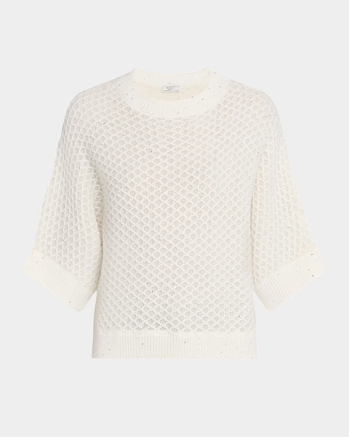 Knit in a blend of sheep and alpaca wool, this Peserico sweater is textured all over with crisscross detailing and sequins Approx. 19.5"L from shoulders to hem Crew neckline 3/4 sleeves; approx. 8"L Relaxed fit Pullover style Virgin wool/wool Unlined Dry clean, machine wash Made in Italy