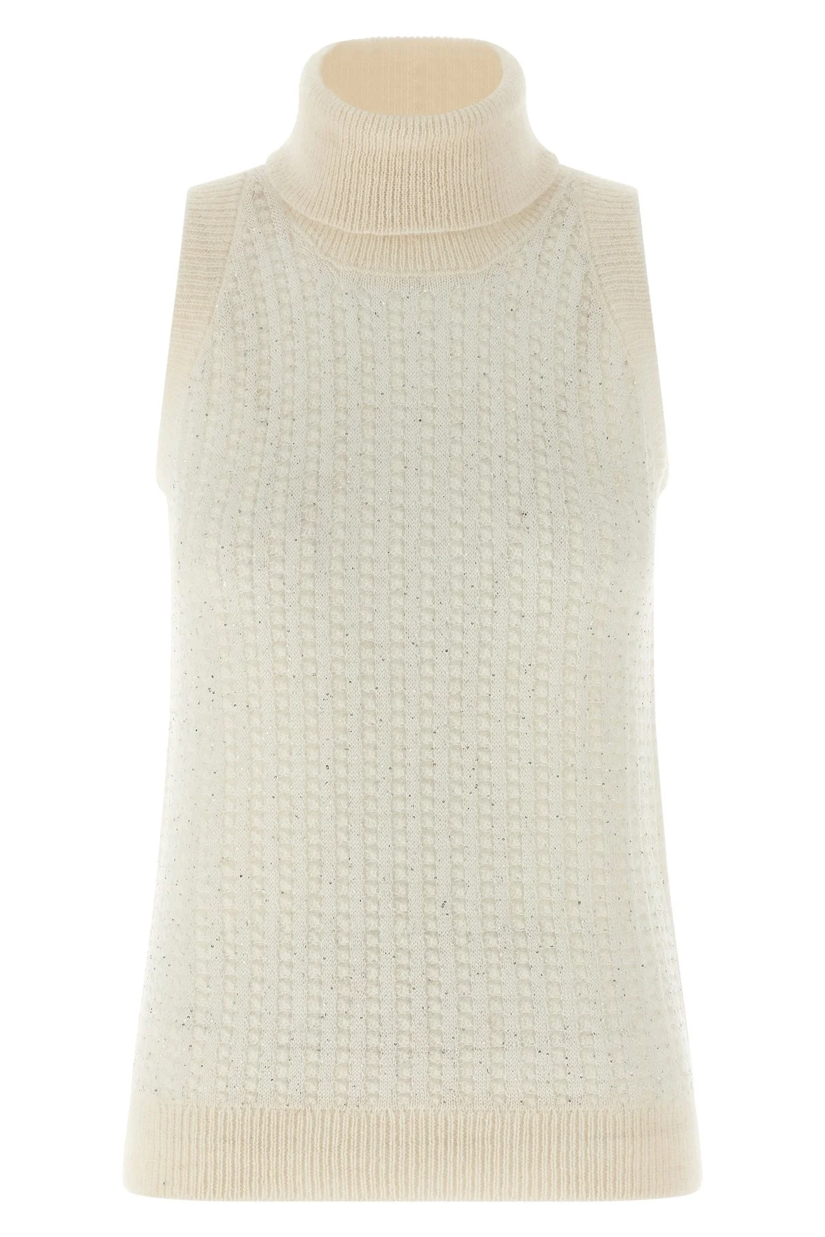 cod. E98197F079217C03C Tricot sweater in alpaca yarn and knitted wool with sequin applique, turned-up high neck, sleeveless. Color: White Size & Fit: true to size fit Composition: 100% polyamide Made in: Italy