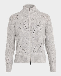 This Peserico sweater is knit with sequins and diamondpatterned pointelle stitches Turtleneck Twoway zip front Drop shoulders Long sleeves Relaxed fit Virgin wool/wool/cotton Machine wash Made in Italy