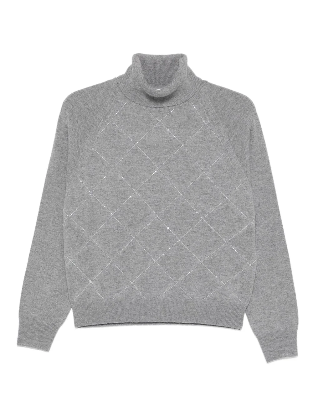 turtleneck sweater Highlights - Grey - Wool-silk-cashmere blend - Diamond pattern - Long sleeves - Straight hem Made in Italy Composition Virgin Wool 55%, Silk 30%, Cashmere 15% SIZE & FIT Model measurements Height 5 ft 11 in(1.8 m) Bust/Chest 31.49 in(80 cm) Hips 36.61 in(93 cm) Waist 24.4 in(62 cm) Washing instructions Read Manufacturer Guidelines