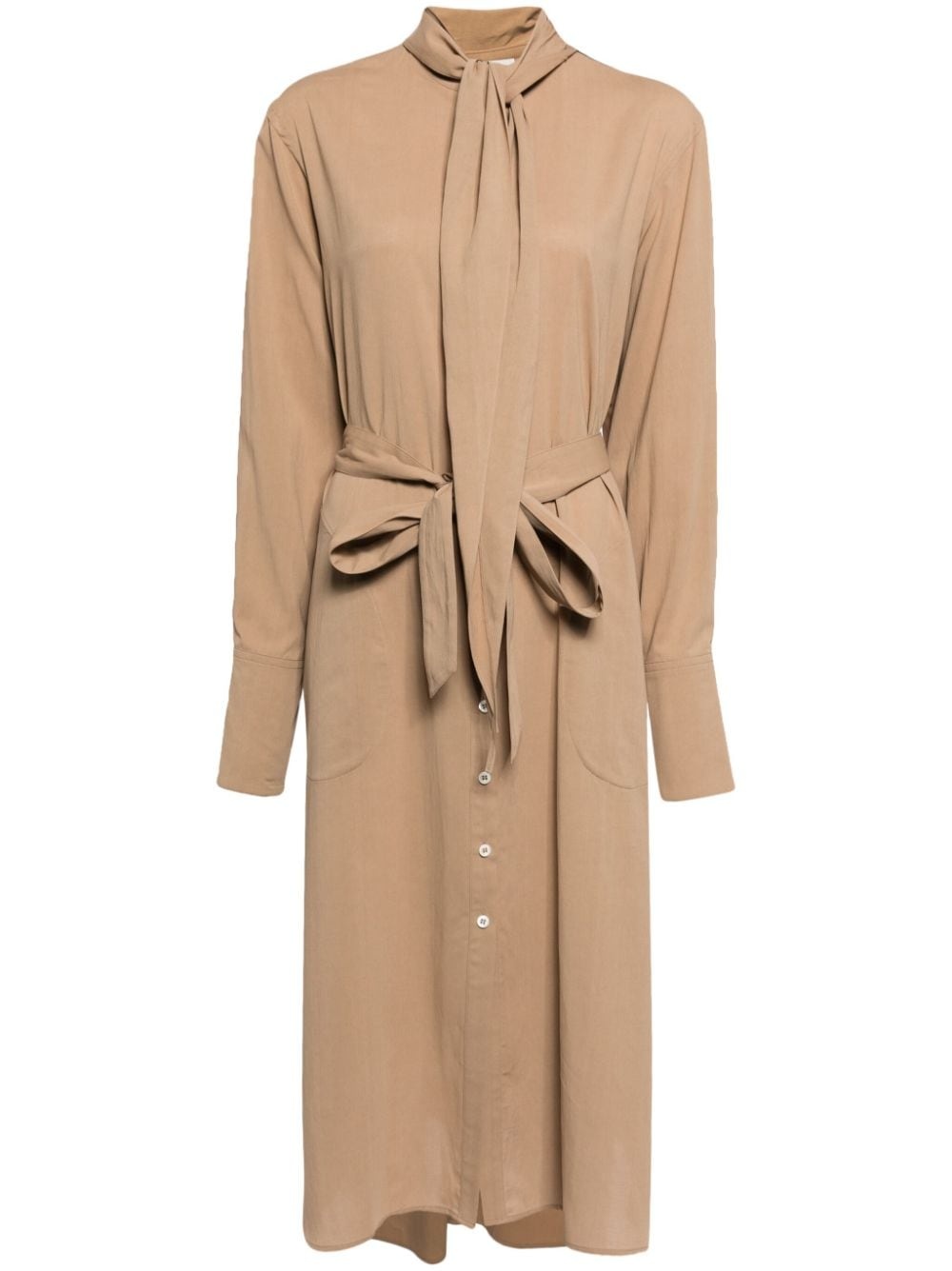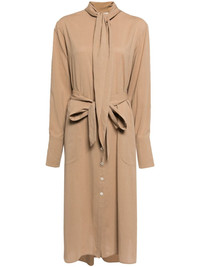 belted handkerchief shirtdress Highlights - Light brown - Attached scarf - High neck - Front button placket - Long sleeves - Buttoned cuffs - Detachable waist belt - Straight hem - Mid-length Made in Italy Composition Viscose 67%, Cotton 33%