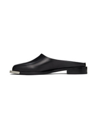 Buffed leather slip-on loafers in black. Metal trim in matte silver-tone at square toe. Logo stamp in silver-tone at black buffed leather footbed. Stacked leather heel. Leather outsole in black. Supplier color: Black/Silver Leather. Made in Italy 211462F121031