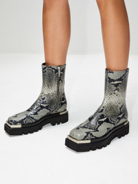 Gleaming metal tips along the square toe and heel counter make this combat boot stand out from the rest. With a raised, chunky treaded sole and snake-printed calfskin leather, this shiny ankle boot is undeniably cool. DETAILS - Made in Italy - Upper: 100% Calfskin - Inner: 100% Calfskin - Sole: 100% Rubber 100% Aluminum - Dry Clean Only - Vendor Style # PD-FW22-907 LE033 - Item # 1-149921 SIZE & FIT - Heel Height: 2 in - Square Toe - Metal Details at Heel and Toe - Side Zip Closure - Treaded Sole - True to Size