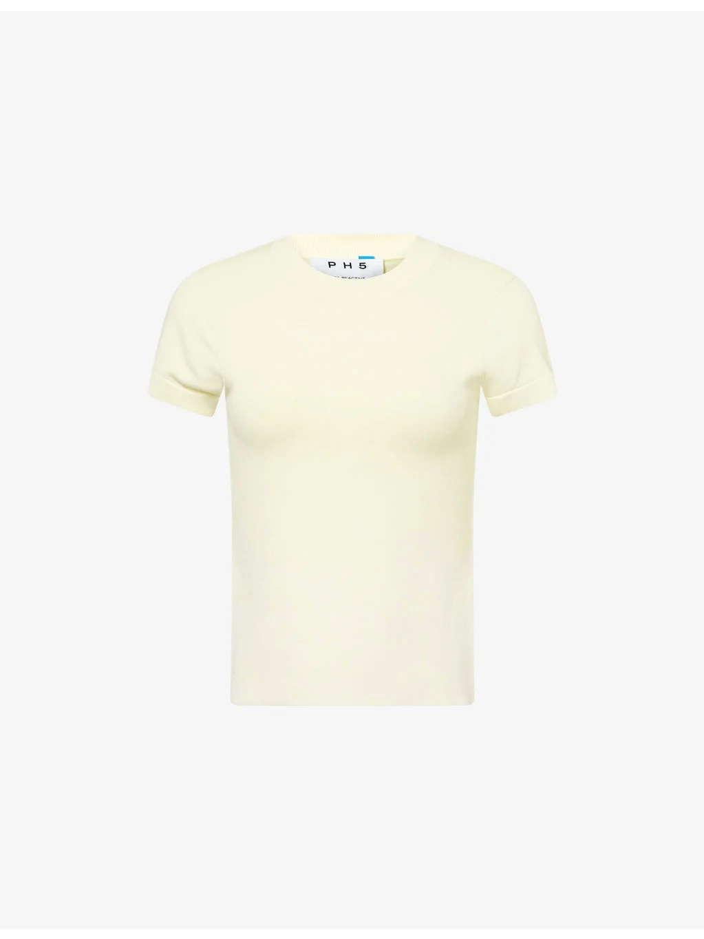 PRODUCT DETAILS - PH5 stretch-woven T-shirt - 65.3% viscose, 23.4% rayon, 9.4% polyester, 1.9% elastane - Slim fit, ribbed round-neck, short sleeves, text and abstract print at front, all-over knitted - Machine wash cold - True to size - Model is 5ft 10in/1.78m and wears a size small - Midweight, stretchy Ref: R04483302