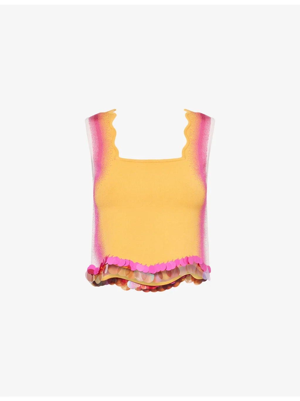 PRODUCT DETAILS - PH5 knitted top - 52% viscose, 25.6% rayon, 16.5% polyester, 3.1% metallic fibres, 2.8% elastane - Regular fit, cropped, square neck, shoulder straps, abstract print at front and back, all-over knitted, sequin embellished wavy hem - Dry clean only - True to size - Model is 5ft 10in/1.78m and wears a size small - Midweight, stretchy Ref: R04483331
