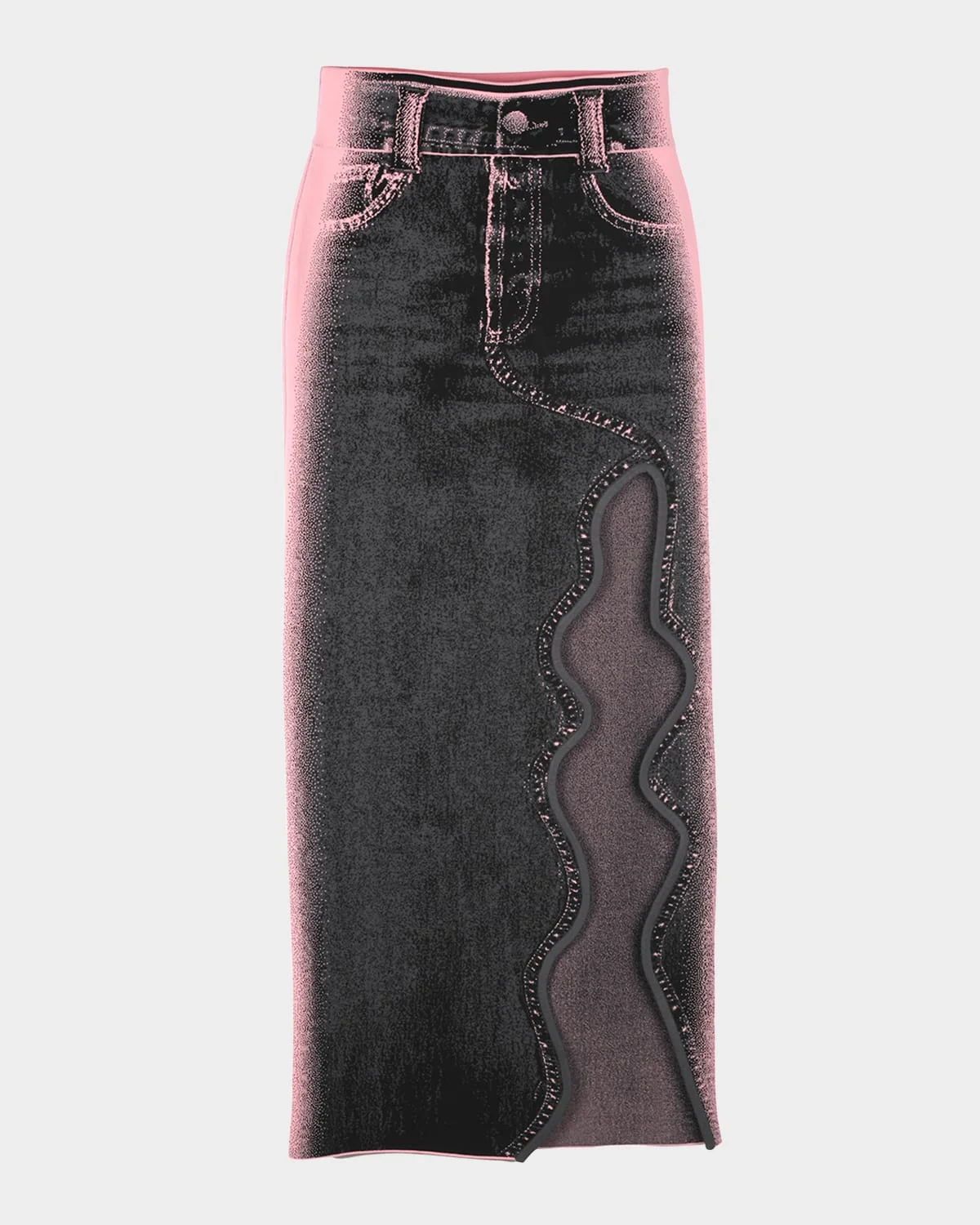 - PH5 "Lily" knit skirt featuring faux denim detailing - High-rise waistband - Wavy asymmetric thigh-high slit; approx. 28"L - Full length - Pencil style - Slip-on style - Viscose - Machine wash cold - Imported