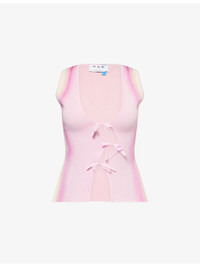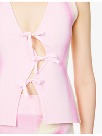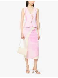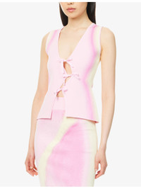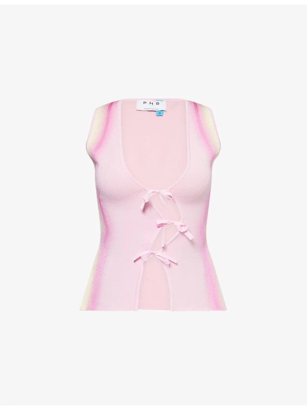 PRODUCT DETAILS - PH5 knitted vest - 71.3% viscose, 17.5% rayon, 9.4% polyester, 1.8% elastane - Self-tie fastening at front - Slim fit, V-neck, sleeveless, cinched waist, wavy fastening at front, all-over abstract print, all-over knitted - Machine wash cold - True to size - Size small: length 21in / 53cm - Model is 5ft 10in/1.78m and wears a size small - Midweight, stretchy Ref: R04483333