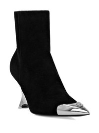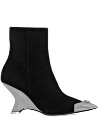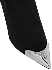 105mm logo-embellished leather boots Highlights - Black/silver-tone - Logo embellishment - Contrasting toecap - Pointed toe - Slip-on style - 105mm high heel Composition Lining: Goat Skin 100%, Acrylonitrile Butadiene Styrene (ABS) 100% Outer: Zinc 100%, Acrylonitrile Butadiene Styrene (ABS) 100%, Calf Leather 100% Sole: Calf Leather 100%